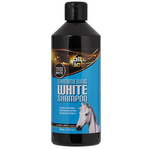 Discover the secret to show-stopping equine brilliance with Alto Shimmering White Shampoo. This premium 500mL formula is a favourite among showies and equestrian competitors for its unparalleled ability to transform even the dirtiest grey or white horses into dazzling beauties.