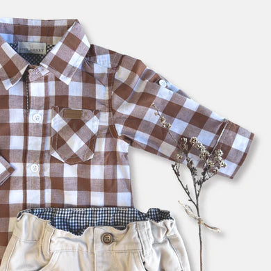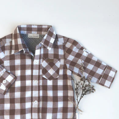 Smart, stylish, and oh-so-practical—our best-selling Dress Shirt Romper in Large Bronze Check is a wardrobe essential for your little one. Featuring a timeless check pattern, this versatile piece is perfect for both special occasions and everyday wear.