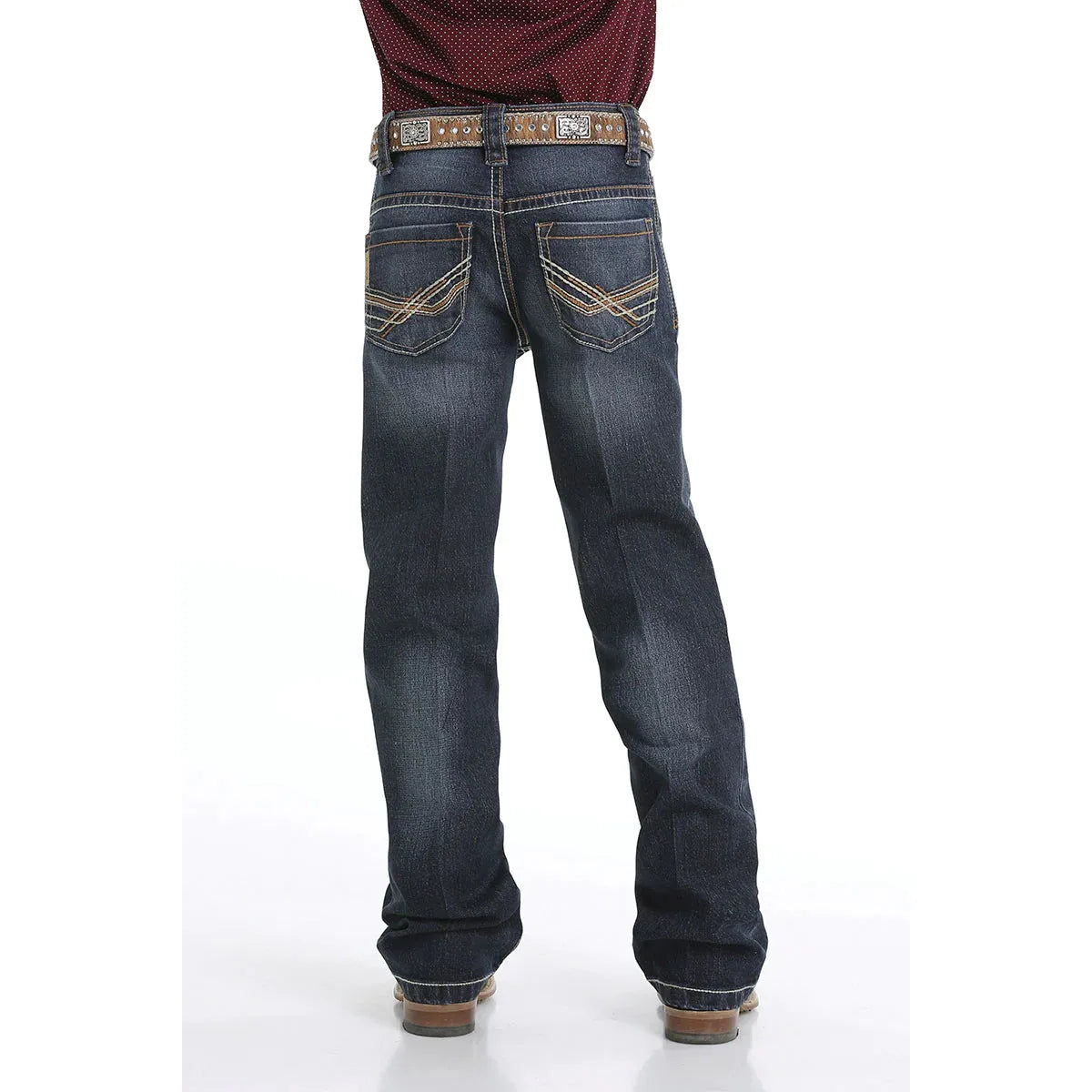 Crafted from performance stretch denim, these relaxed-fit jeans offer comfort and durability for active boys. Featuring a classic rinse finish enhanced with tinting, hand sanding, whiskers, and chevron details, they deliver authentic Western style. Cream and amber embroidered back pockets paired with copper hardware add a distinctive touch of craftsmanship and continuous style.