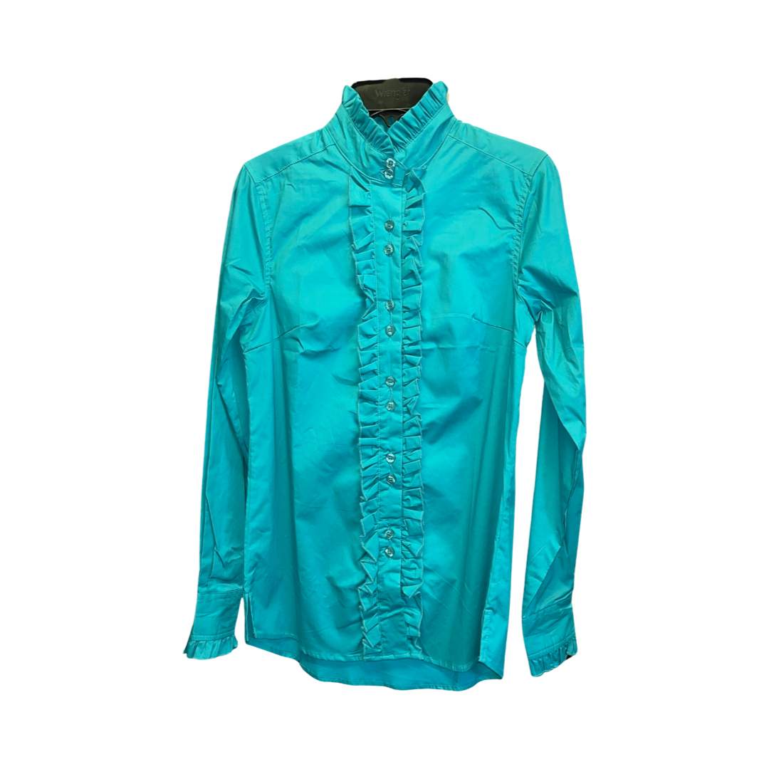 Pretty in Sea Green. A ruffle detailed front, this is the shirt for business or pleasure. The ruffles and fit give it a great practical, yet feminine feel. Comfortable generous fit, long sleeves, and button-down front, this shirt is perfect to pair with any Outback jeans.