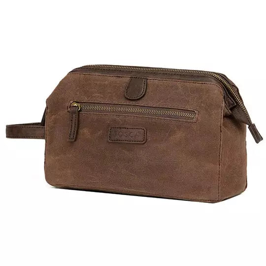 Waxed canvas wash bag from TOSCA that is a great size for when you need to bring more than just your toothbrush. The wash bag is large enough to hold your shaving gear, shampoo, deodorant, toothbrush and paste, soap and more. This bag is made with waxed leather and is super easy to clean.