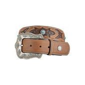 The Wrangler Jessica Belt is a beautifully crafted Western accessory made from genuine leather. It features a striking cutout design with a tooled inlay, accented by flower conchos set with turquoise stones. A Wrangler logo concho with snaps and antique silver hardware complete the look, giving this belt authentic Western charm with a feminine touch.