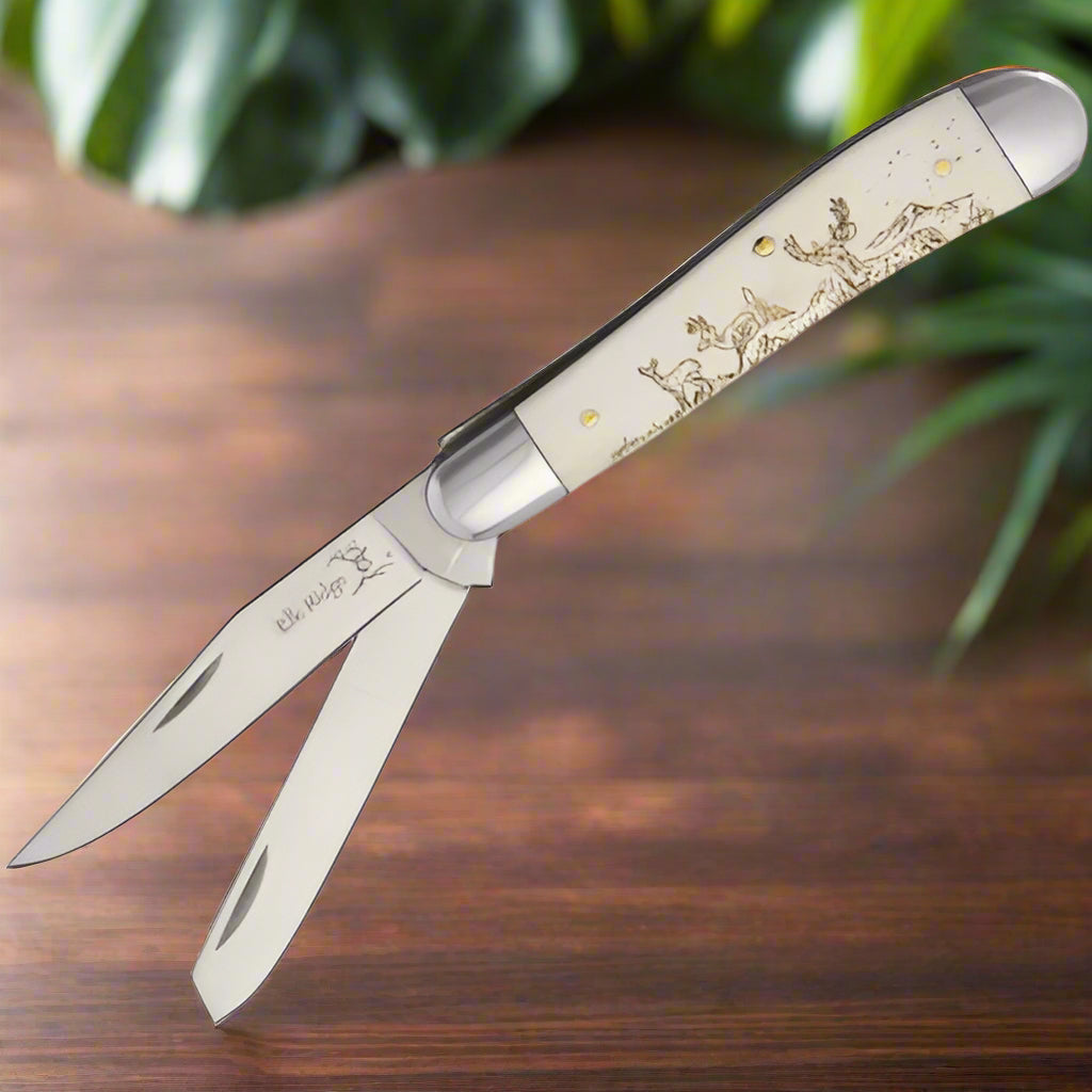 Handle: Smooth bone handle scales featuring detailed deer artwork