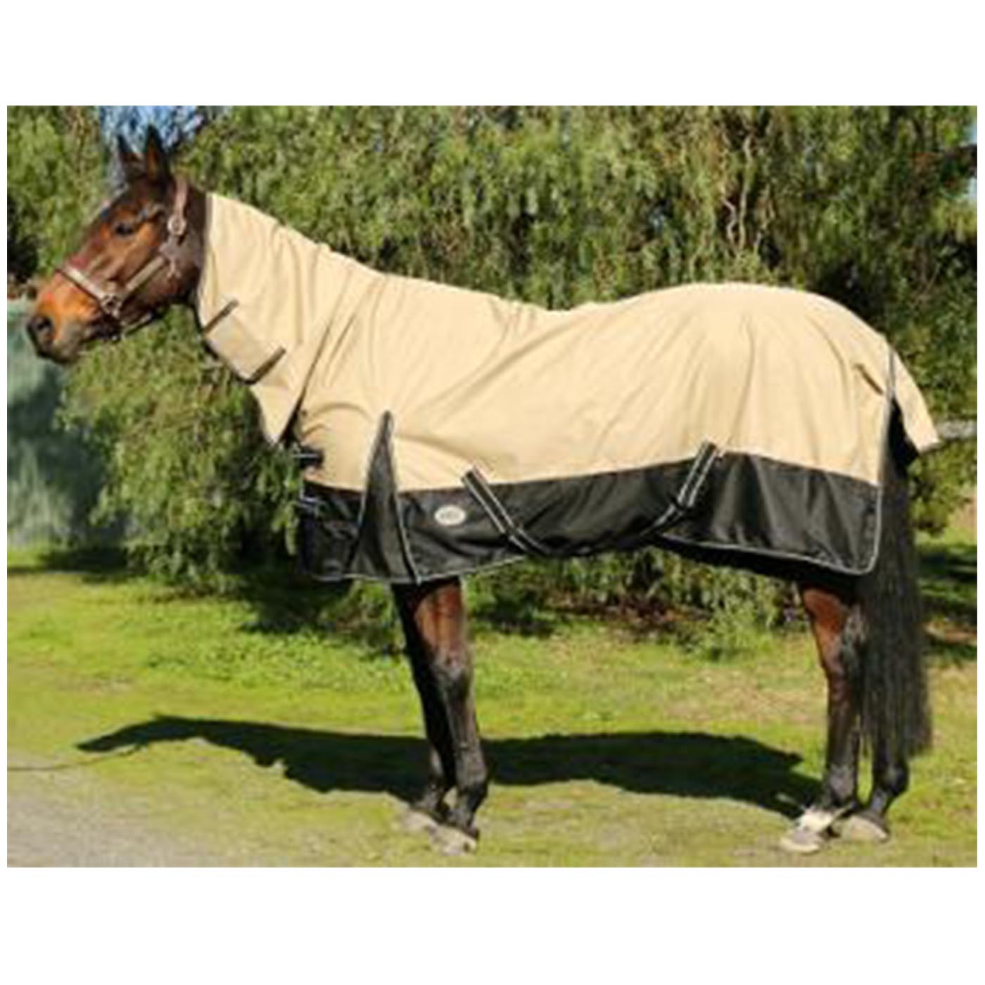Eureka 600 Denier Waterproof Breathable Ripstop Combo with ripstop grids to provide extra fabric strength. A Quality waterproofing treatment process has been applied to this fully cotton lined body with satin lined shoulders, chest, lower panels and combo neck. Complete with double cross over surcingles, double chest strap system, shoulder gussets, rump darts, removable leg straps and tail flap