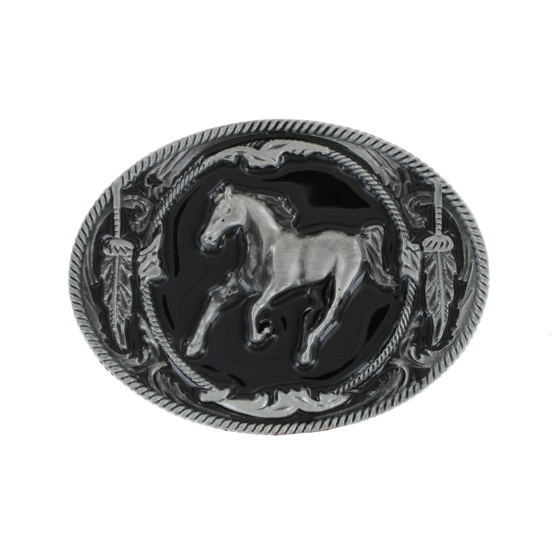 Design: Striking black and silver buckle featuring a galloping horse with feather accents