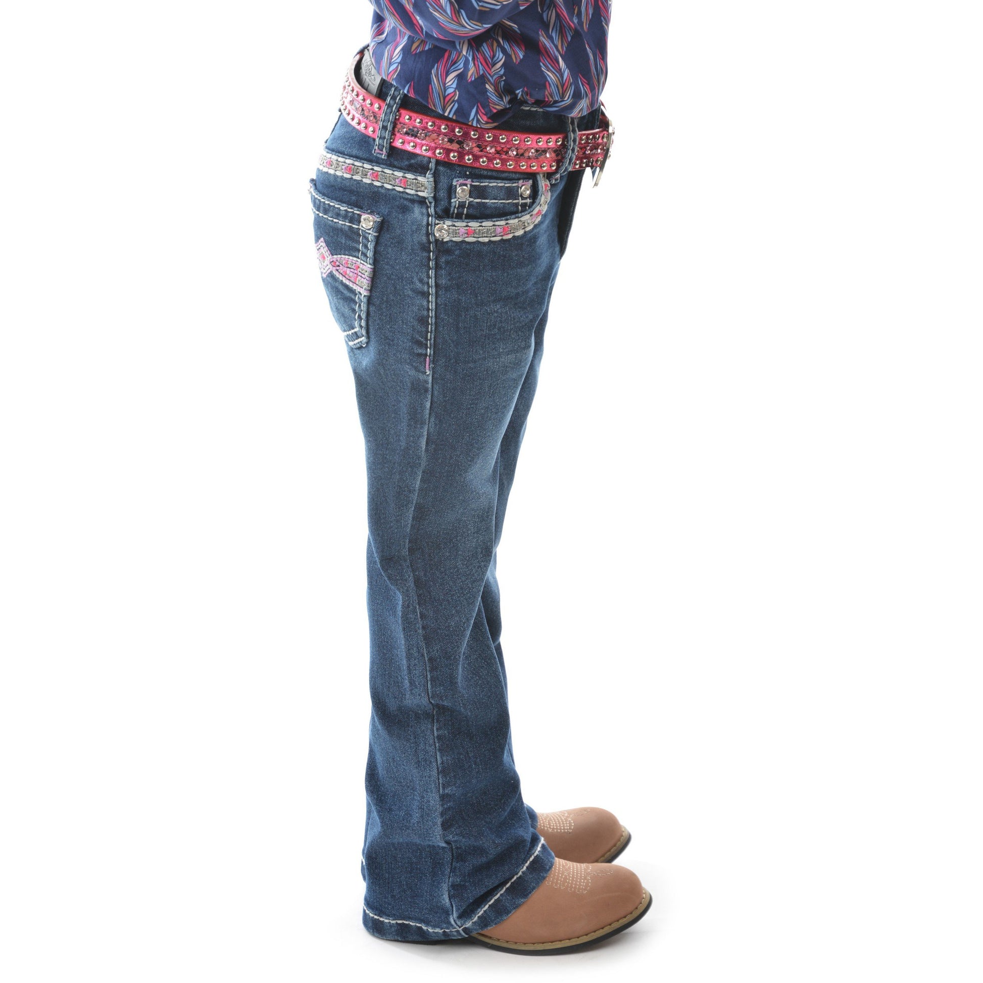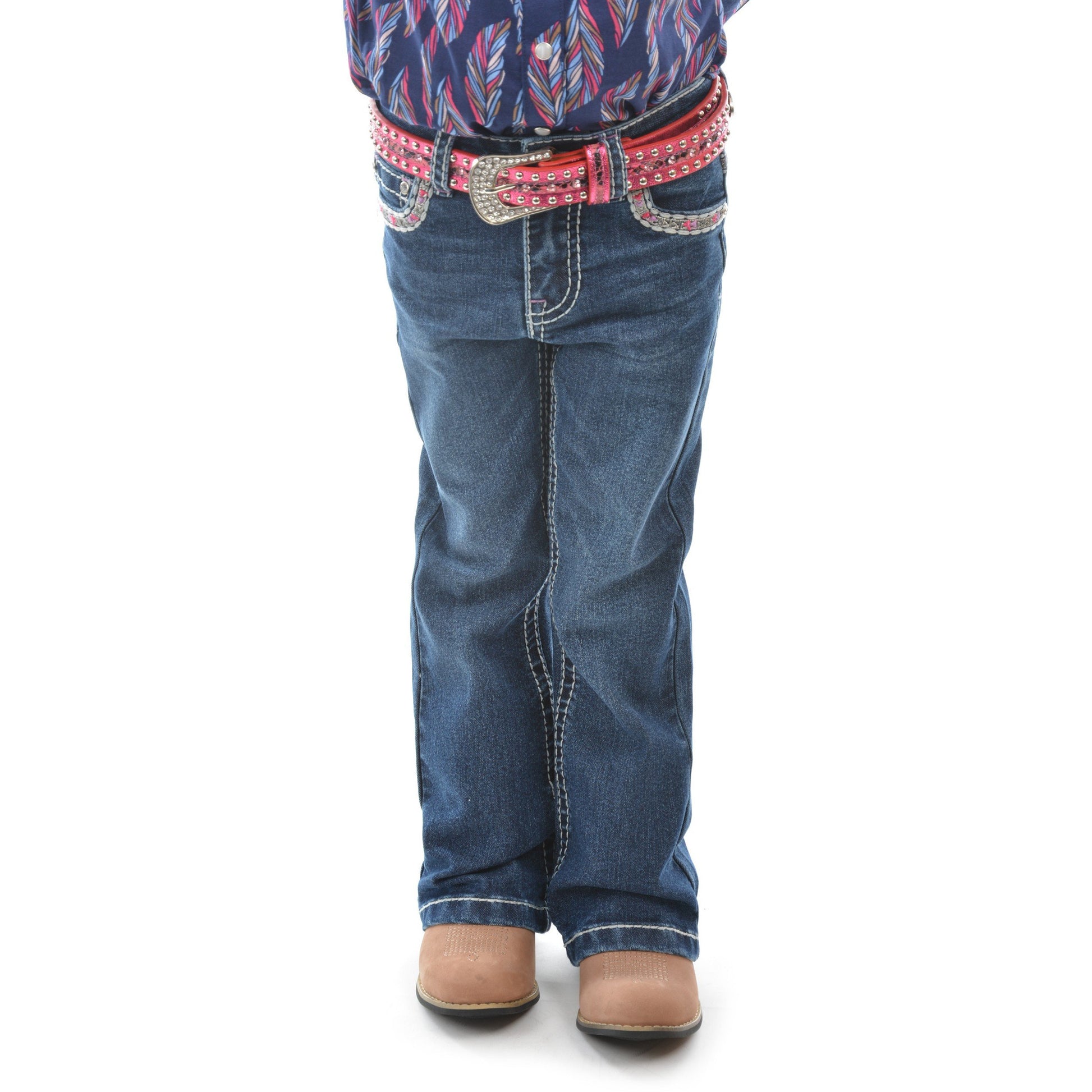 Features: Stretch for comfort, adjustable elastic waistband on all sizes, logo shank button, mock leather logo badge on back waistband, feature back pocket, yoke and front scoop pocket embroidery, diamanté rivets