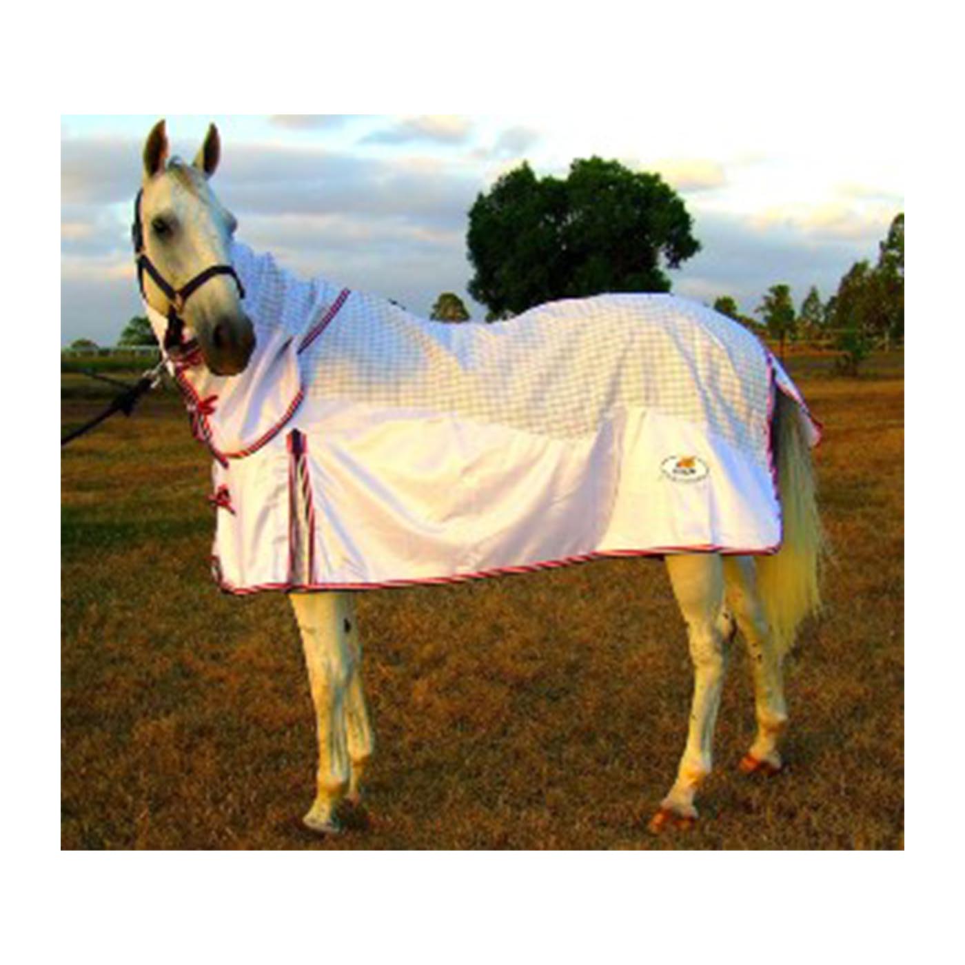 Breezy Combo The 'BREEZY' is made from 14oz double ripstop fabric with inserts of strong mesh fabric for perfect airflow which will keep the horse cool on those hot days. This combo has shoulder gussets, large tent tail flap and sizes 5'6 to 6'9 have double webbing chest straps. Super cool with satin in neck and shoulders and all metal fittings