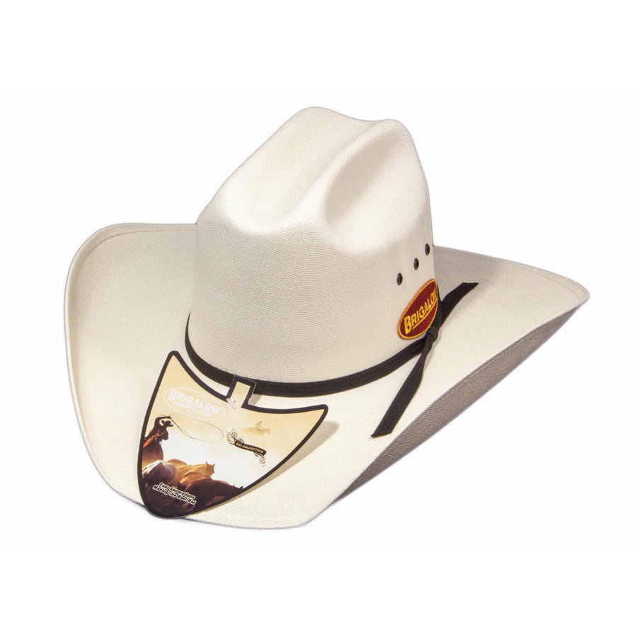 This kids’ white straw hat features a traditional cattleman-style crown, a shaped 4" brim, and three air holes on the crown’s side for ventilation. A black ribbon hat band adds classic contrast.