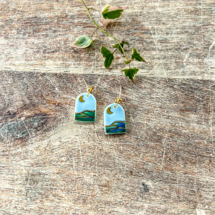 All the earrings are designed and handcrafted by me in my studio in the hinterland of Agnes Water in Australia. Each piece is fired multiple times in a kiln, with temperatures up to 1250 Celsius degree. This gives the jewellery a stone like appearance as well as qualities (doesn’t absorb water, has a stone feel to it and absorb body temperature) and therefore they are sustainable. These earrings have gold plated stud posts and come on a white display card (with Wolf and Clay logo).