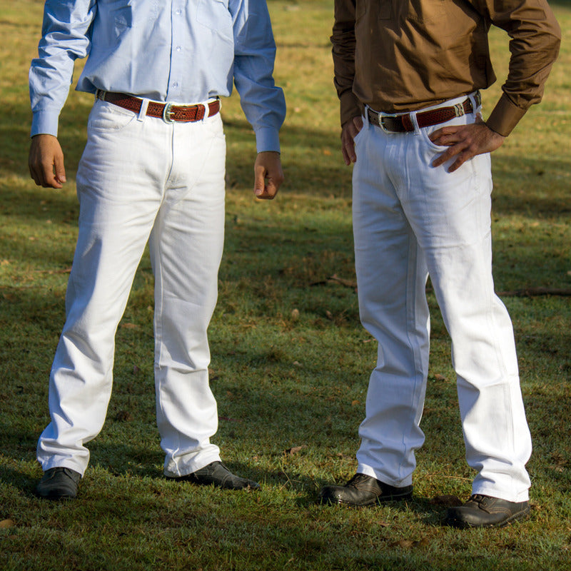 Classic Western style combined with durable comfort, these Men’s White Regular Rise Western Boot Cut Jeans are crafted from sturdy 13.5-ounce sanforised white cotton. Pre-washed and shrunk for a reliable fit, they feature a slightly tapered Western boot cut with a straight leg designed to fit smoothly over boots. Practical details include five pockets, reinforced stress points for extra durability, wide belt loops, and a regular rise waist for comfortable wear all day long.