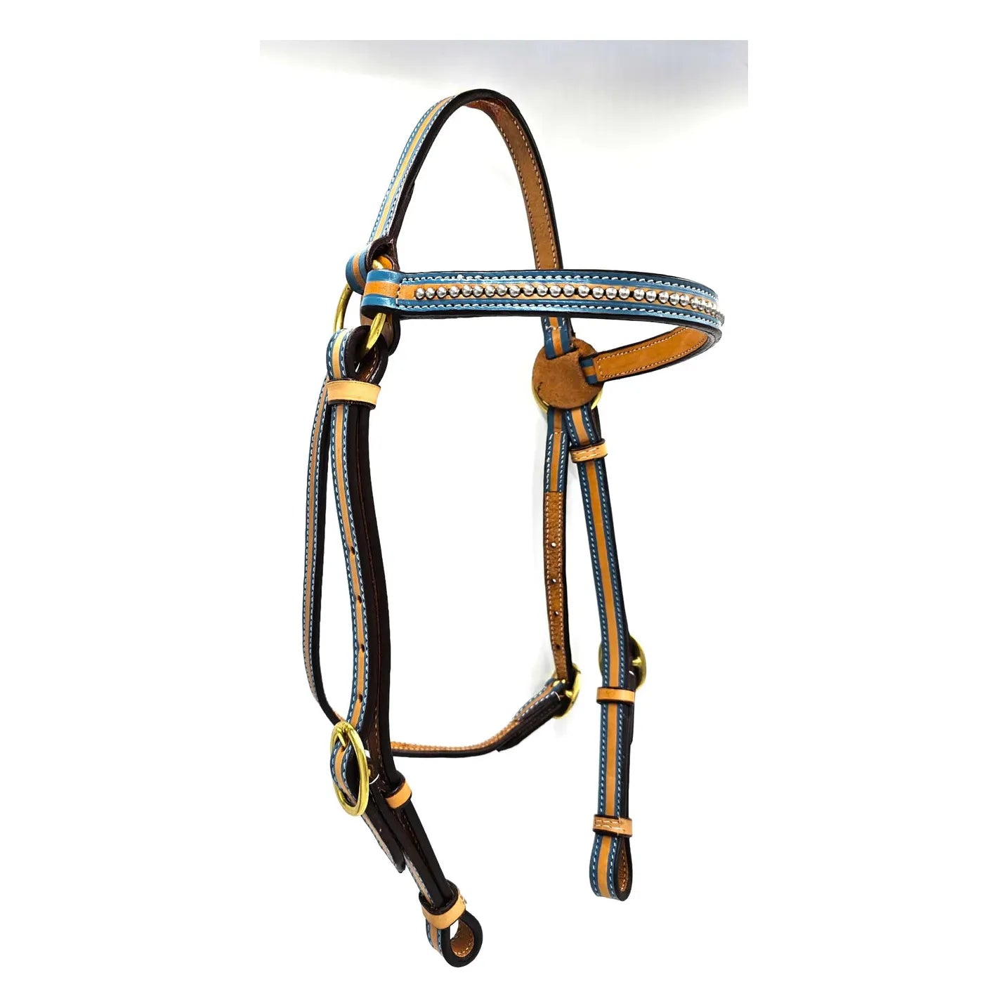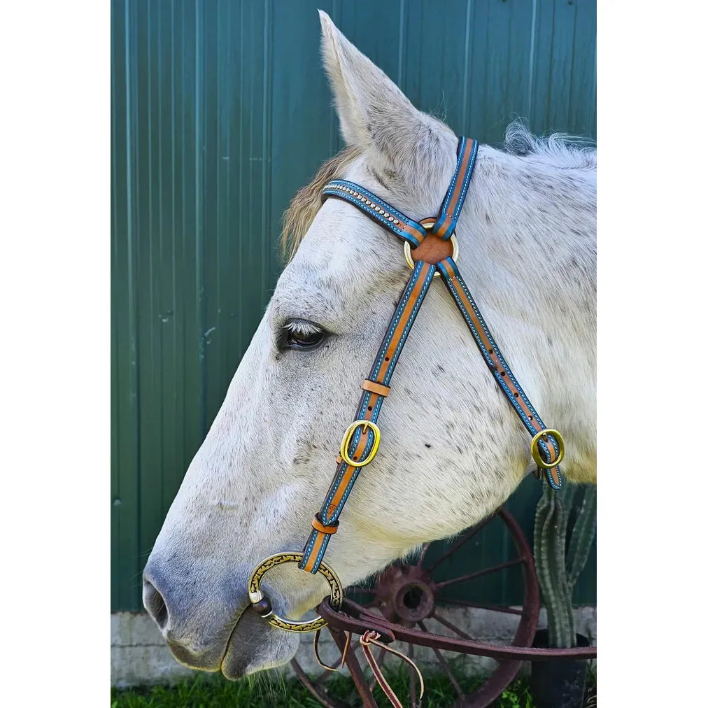 Traditional style meets eye-catching detail in this beautifully crafted Barcoo bridle. Made from premium natural harness leather, it features a ¾" width for a refined look and feel. The browband is finished with a striking turquoise outline and silver stud accents—adding a pop of personality to a timeless design.
