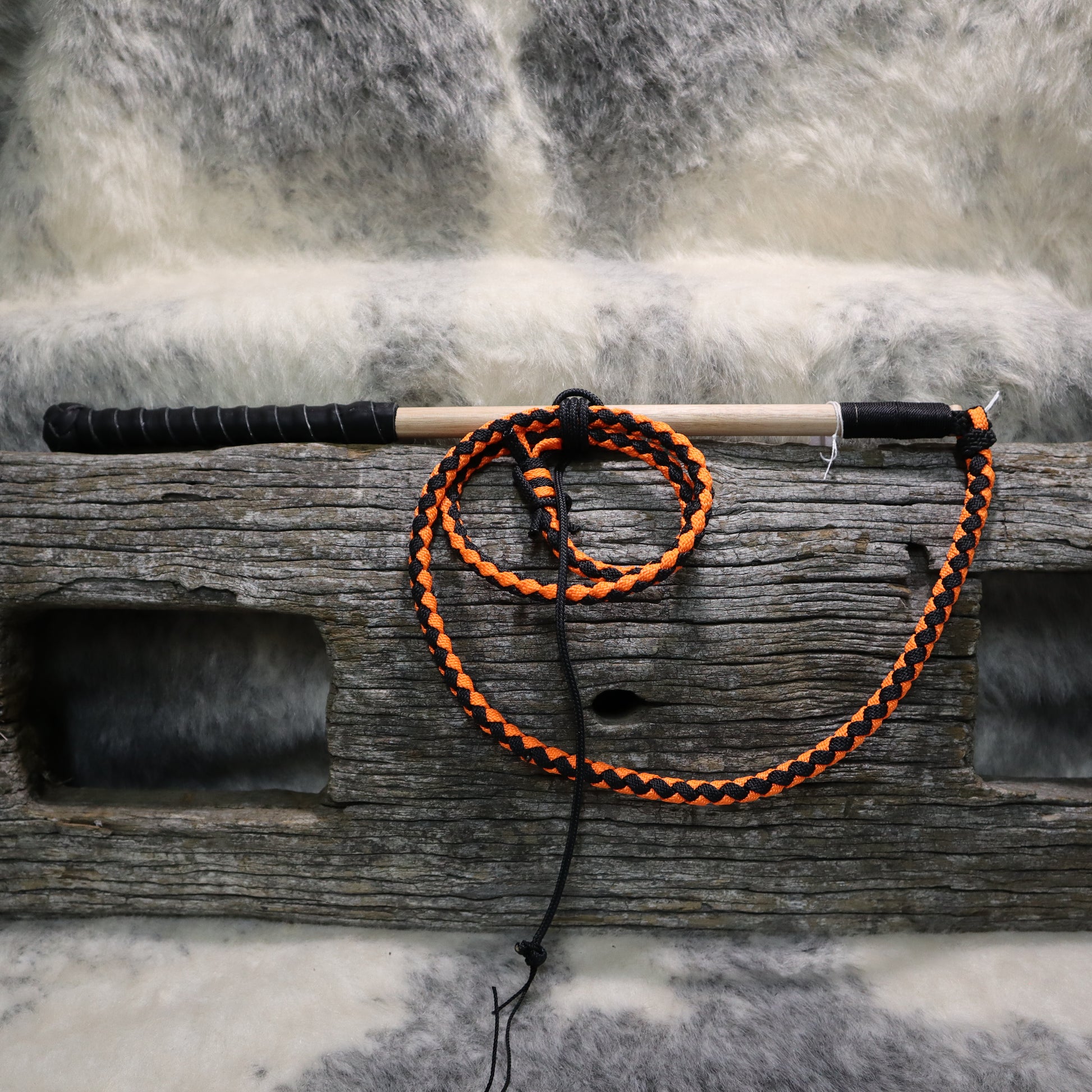 This whip is made from nylon cord and can come in one tone (black), or two tone (black and colour). The end of the whip has a 2.5 ft nylon fall with our Martin Outback cracker. The benefit of a nylon whip and fall is it is stronger than leather, making it more resistant to wear and tear. The handle is Tasmanian Oak, with a wrapped cowhide leather and finished with a Turks head (Turk's head excl. 2.5ft)