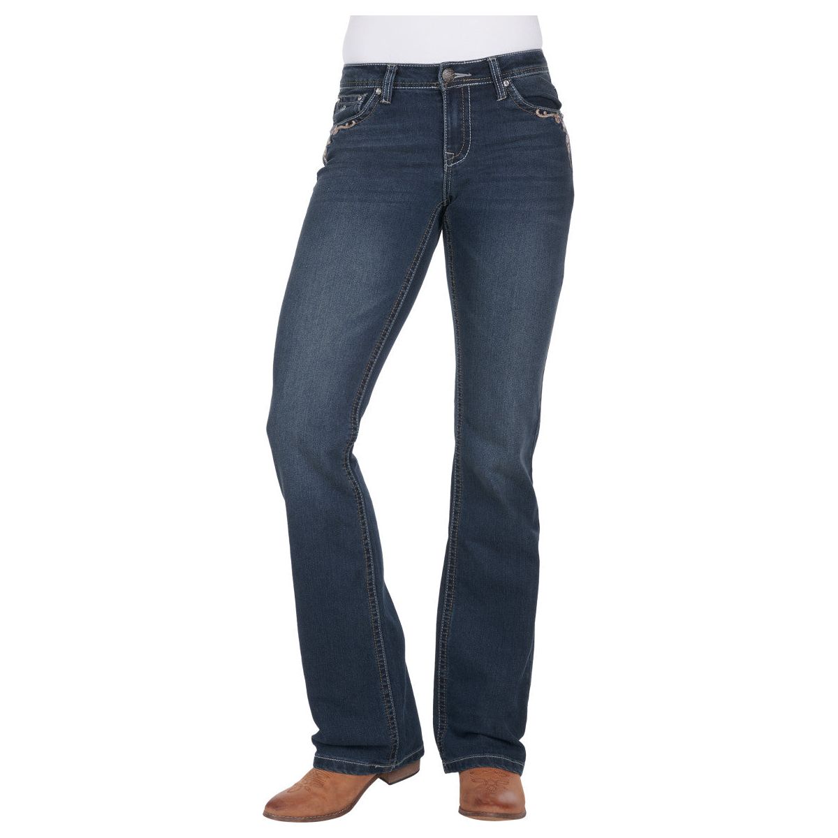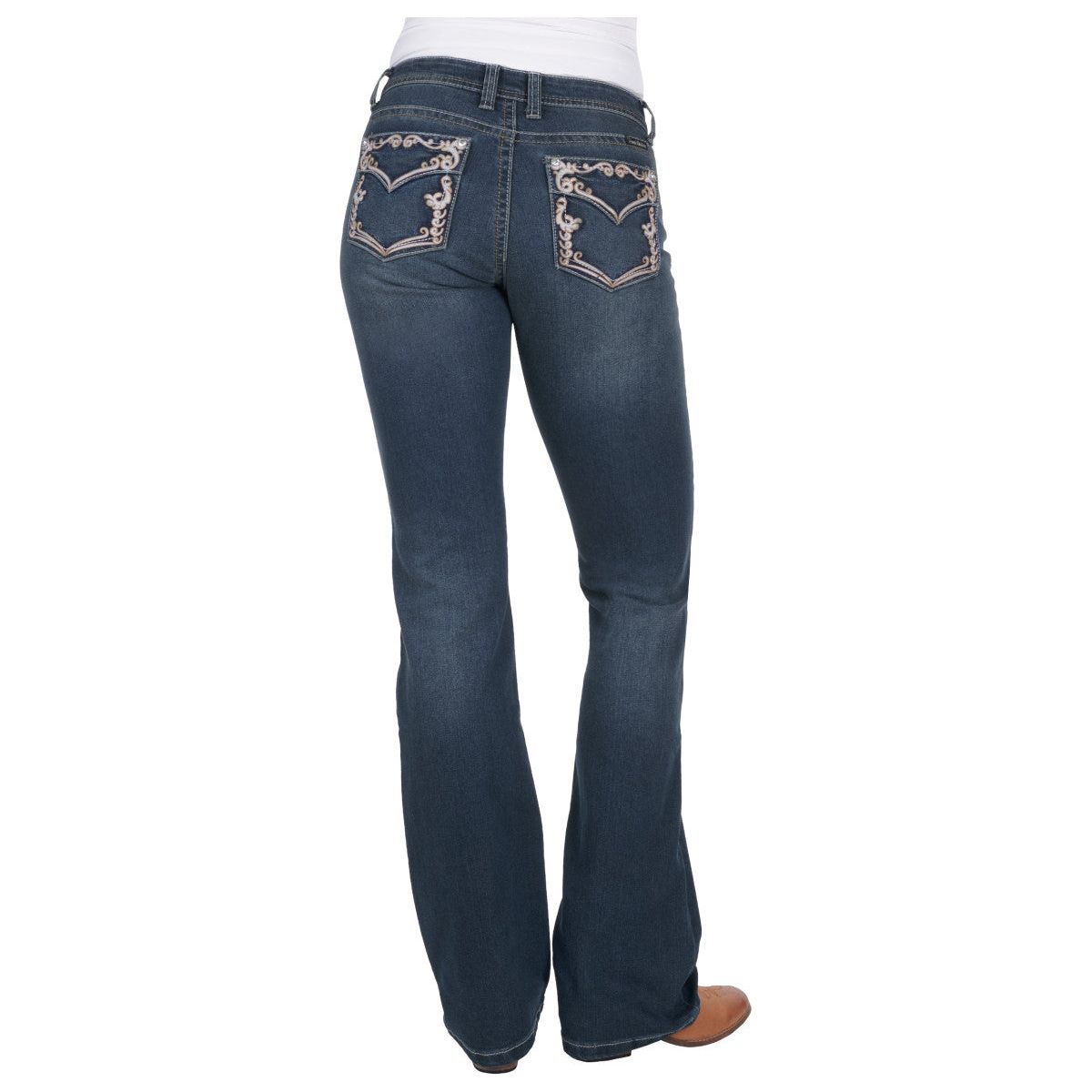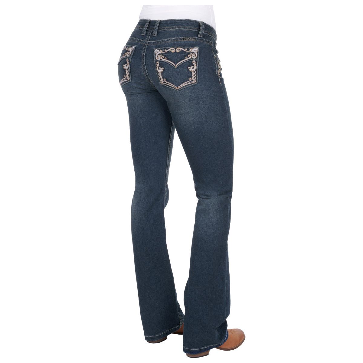 36 Inch leg - boot cut, extra leg room through knee and thigh for added movement, stretch for comfort, mid-rise with slightly higher back rise, logo shank button, diamante rivets, feature embroidery on back pockets and front scoop pockets, contrast all over topstitch