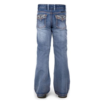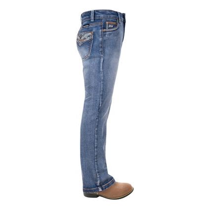 Boot cut, stretch for comfort and movement, mid-rise, adjustable elastic waistband on all sizes, logo shank button, metal rivets, woven logo label on back yoke, feature embroidery on back pockets, front scoop pockets and coin pocket, PW embroidery on coin pocket, contrast all over topstitch.