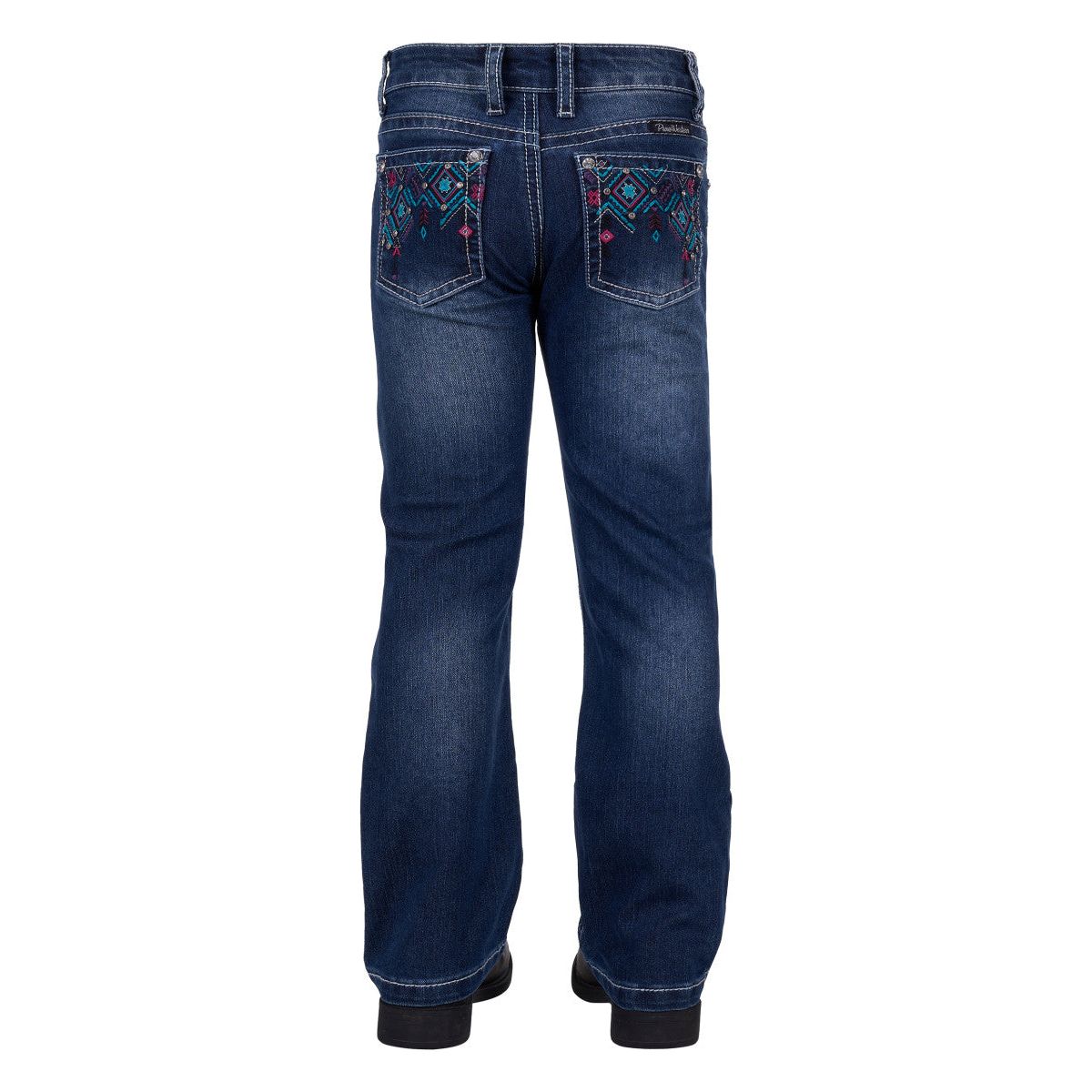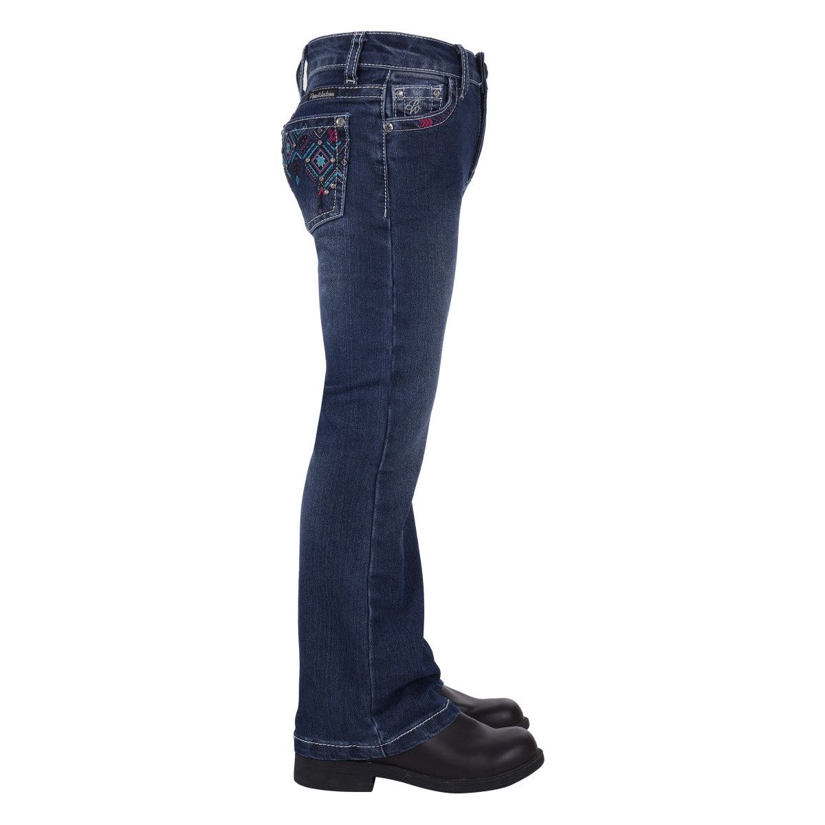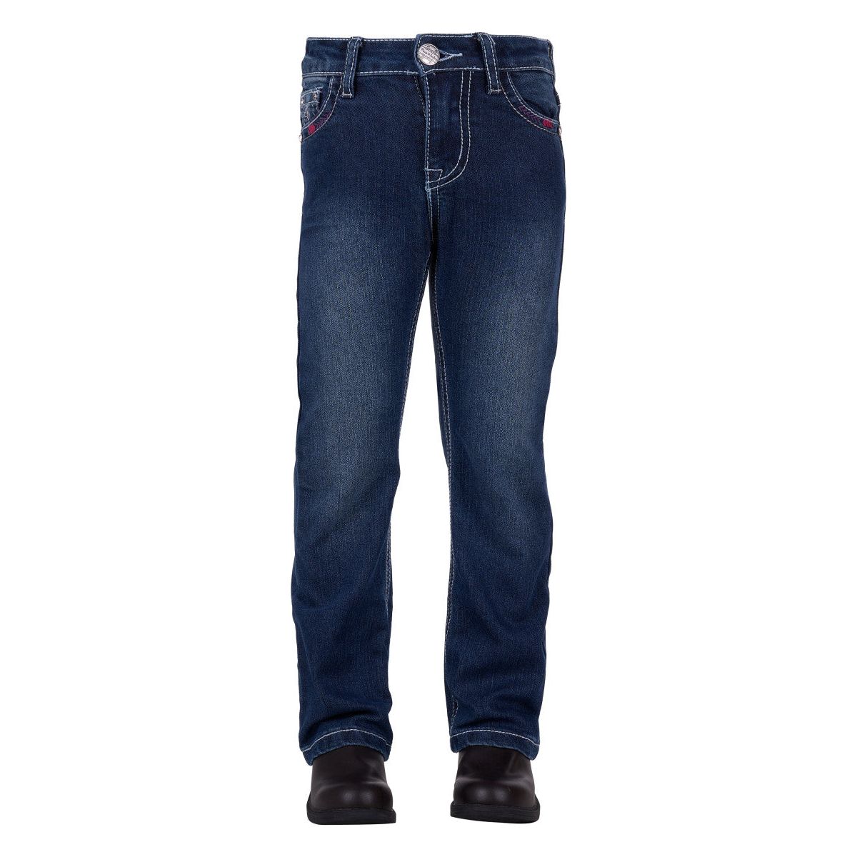 Boot cut, stretch for comfort, mid-rise, adjustable elastic waistband on all sizes, logo shank button, diamante rivets, woven logo label on back yoke, feature embroidery on back pockets and front scoop pockets, PW embroidery on coin pocket, contrast all over topstitch