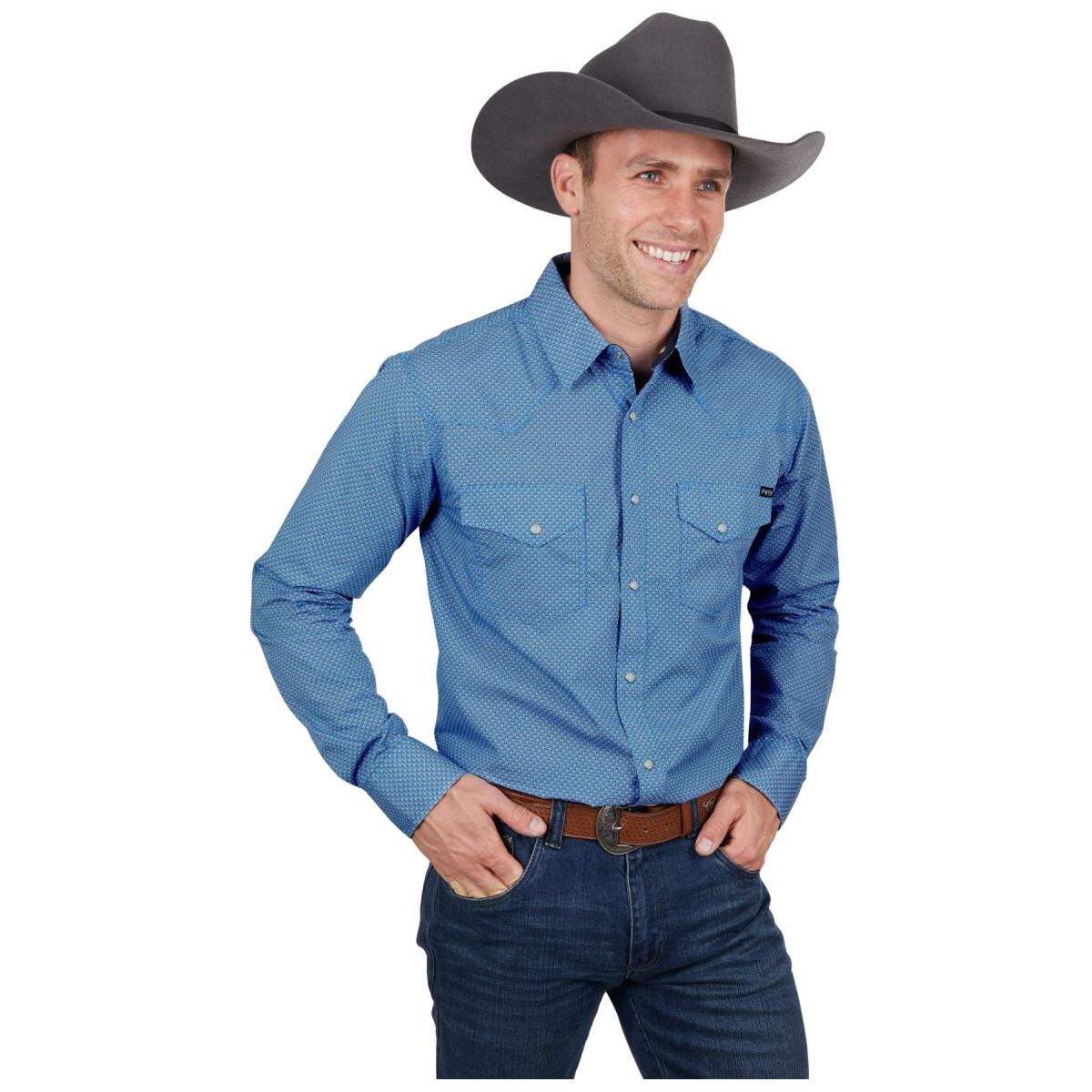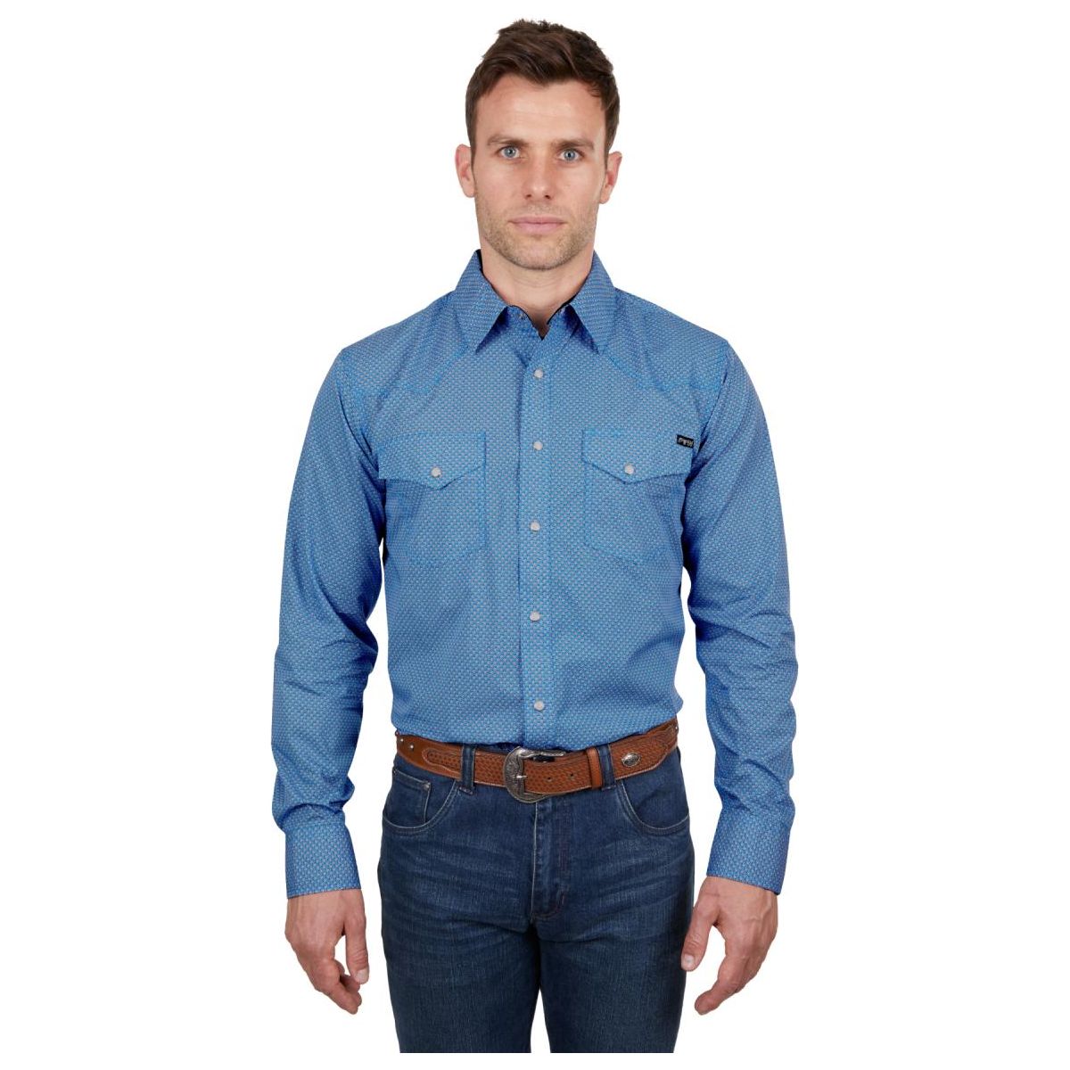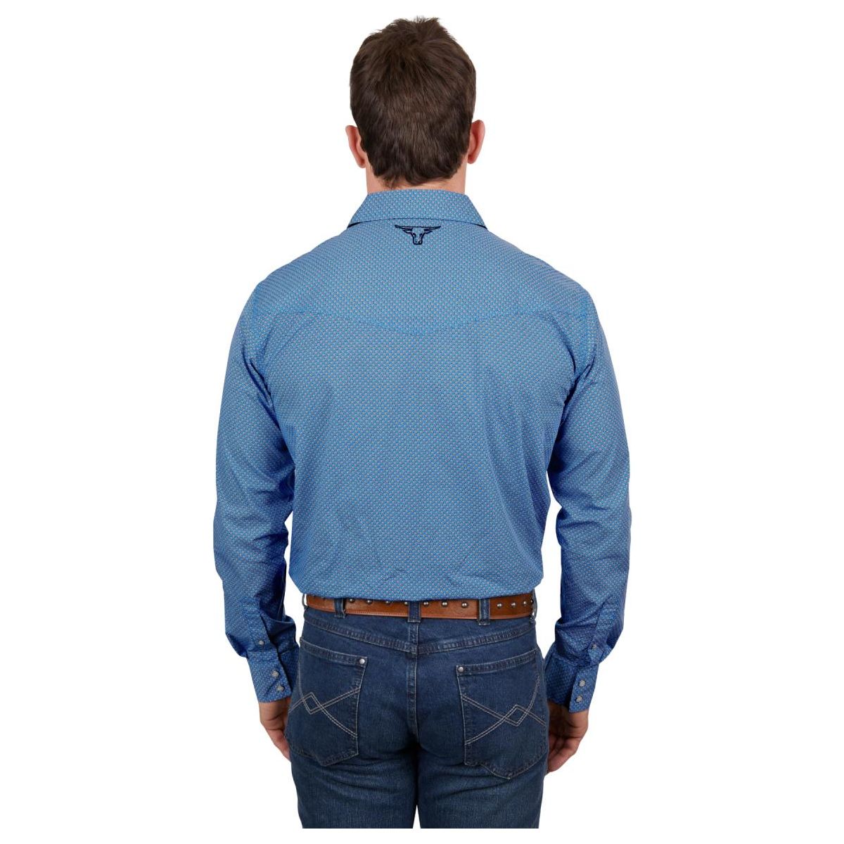 Classic western long sleeve shirt with geometric print, Snap closure, Western chest pockets, one with pen holder, Western front and back yokes, Contrast trim on inside collar stand, Triple needle stitch detail on yokes and armholes, Pure Western back neck embroidery
