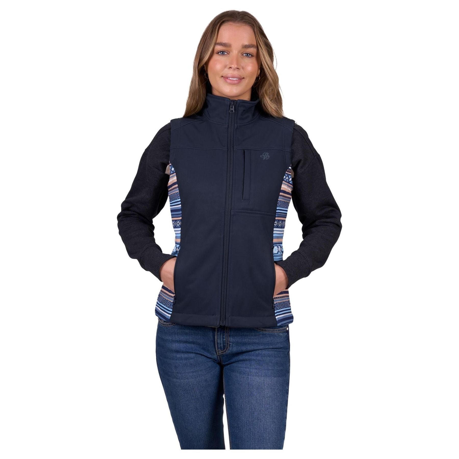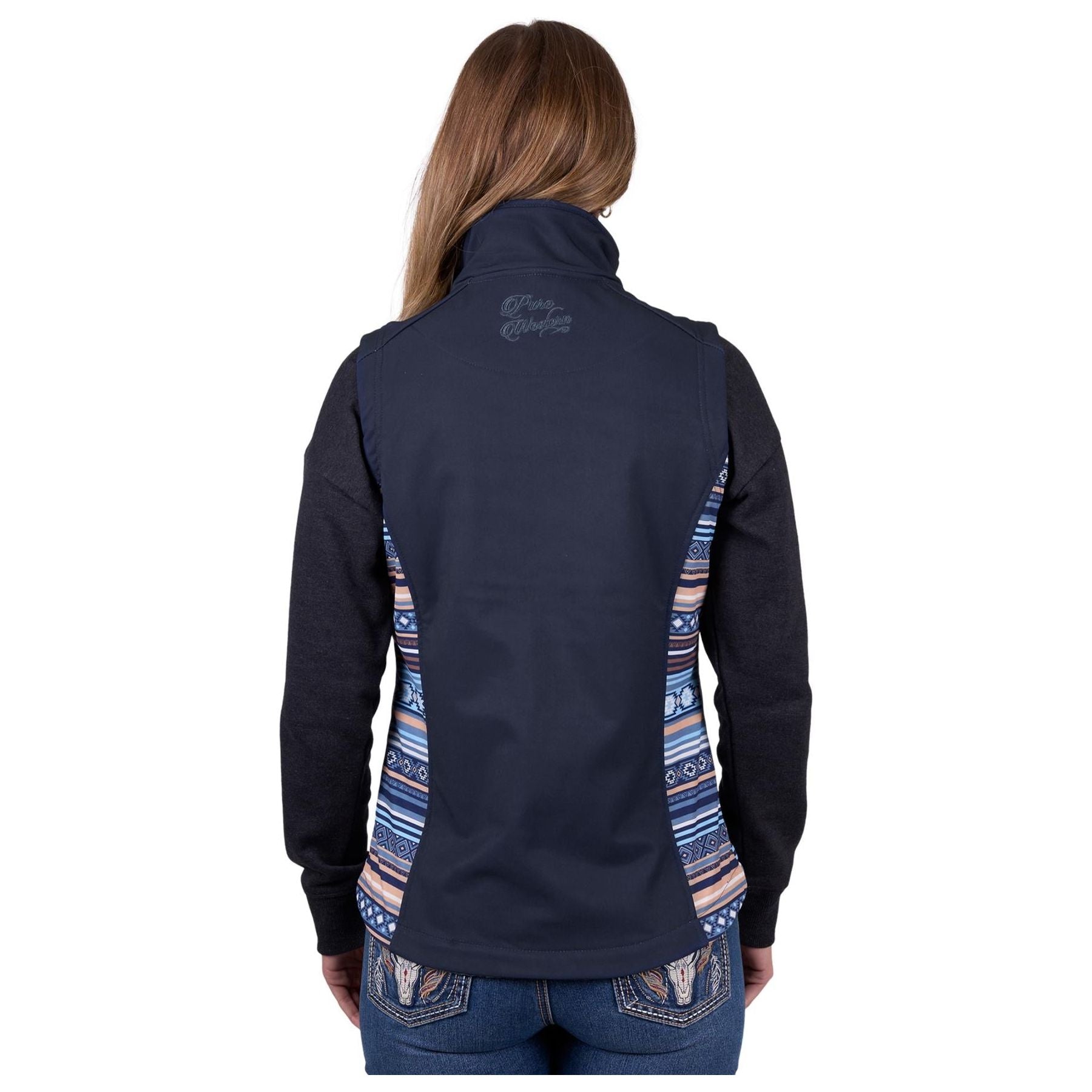 Vest with bonded Aztec print polar fleece lining; waterproof soft-shell fabric; weather-resistant rating 6000; side zip pockets; chest welt pocket with zip; centre front zip fastening; curved longer back hem