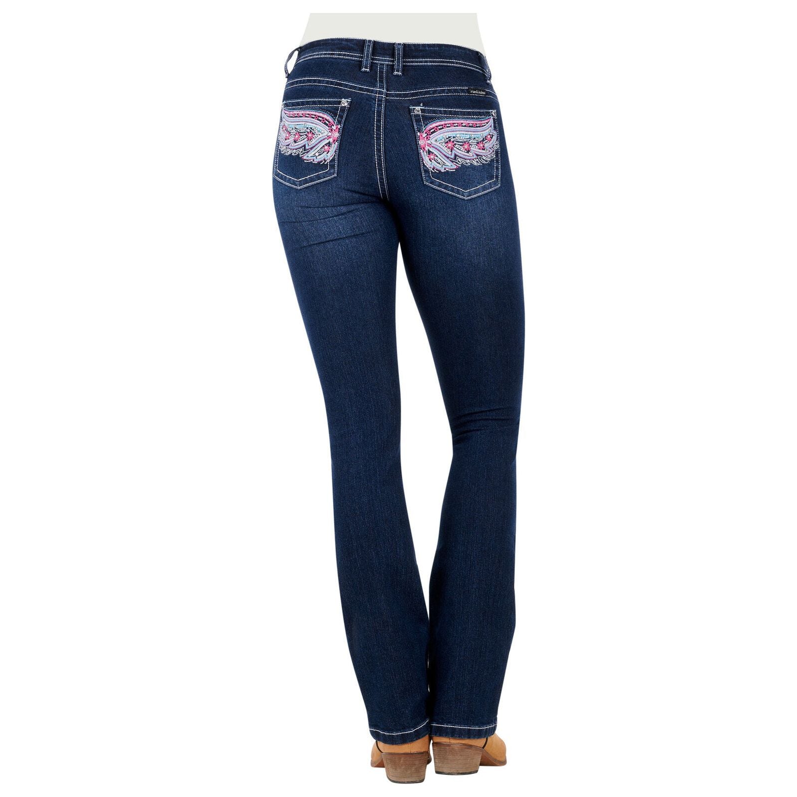 34” leg - boot cut, stretch for comfort and movement, mid-rise, logo shank button, diamante rivets, woven logo label on back yoke, feature embroidery on back pockets, front scoop pockets and coin pockets, PW embroidery on coin pocket, contrast all over topstitch