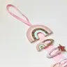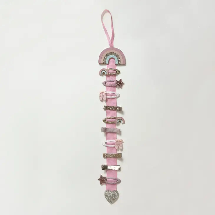 The perfect solution to storing and organizing hair clips in one place - our clip hanger has a hanging loop that can be hung on a door or wall hook. Simply snap on your clips ready to wear again next time! Our rainbow clip hanger can fit around 12 clips (depending on clip size) and hangs perfectly on a grosgrain ribbon! Full drop length: 53cm. Clip hanging space:33cm.