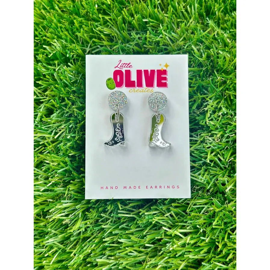 Yee-haw!!! Silver Mirror Cowboy Boots Dangle Earrings - Western Glamour Introducing our Gold Mirror Cowboy Boots Dangle Earrings - Western Charm with a Touch of Glamour! Elevate your style with these unique and eye-catching earrings that celebrate the spirit of the Wild West. Crafted with precision, these earrings feature lustrous gold mirror acrylic in the shape of charming cowboy boots. Designed for both fashion and comfort, these earrings have a total drop length of approximately 65mm, making them an ideal statement piece for any occasion. To ensure your comfort and peace of mind, these earrings come with stainless steel hypoallergenic posts, perfect for those with sensitive ears.