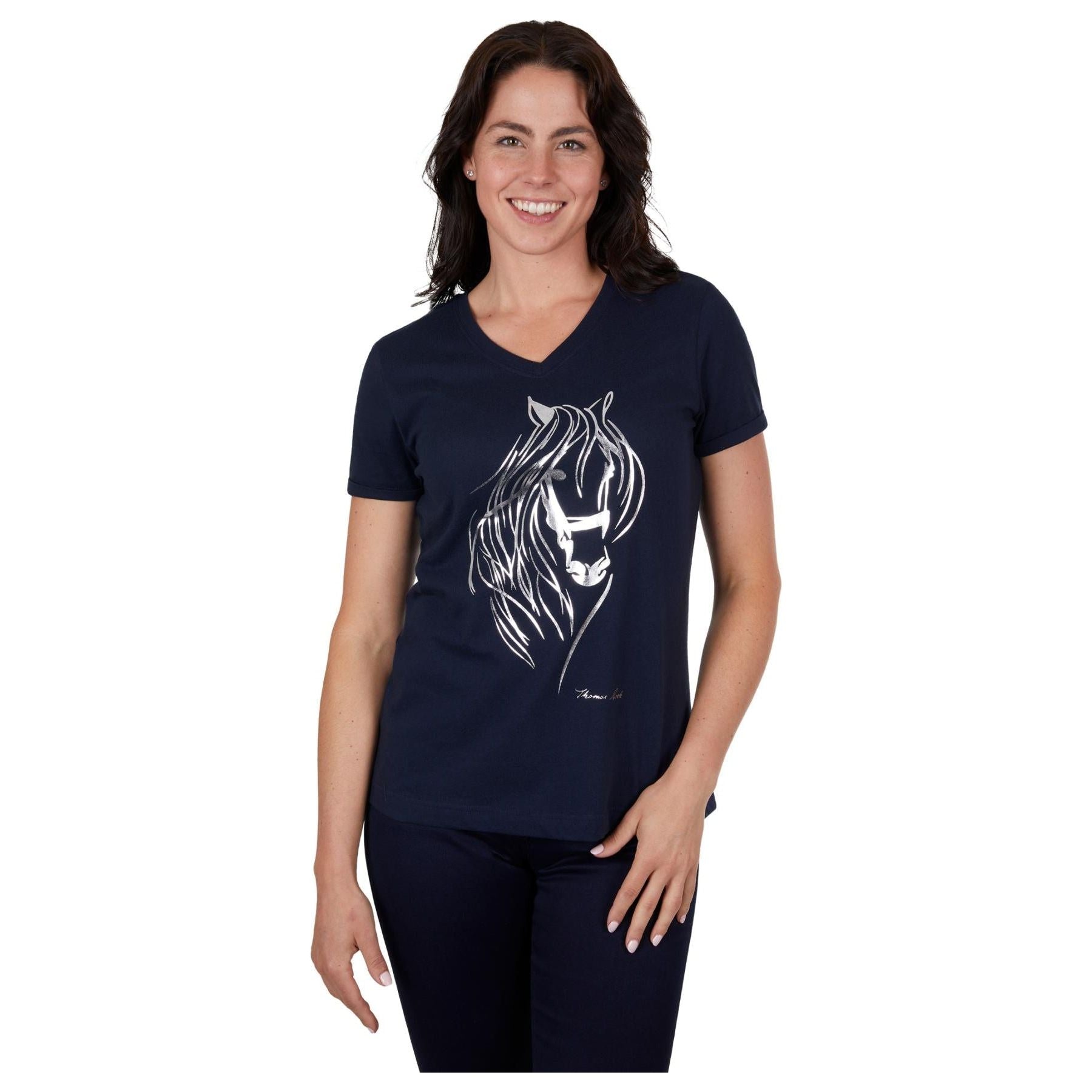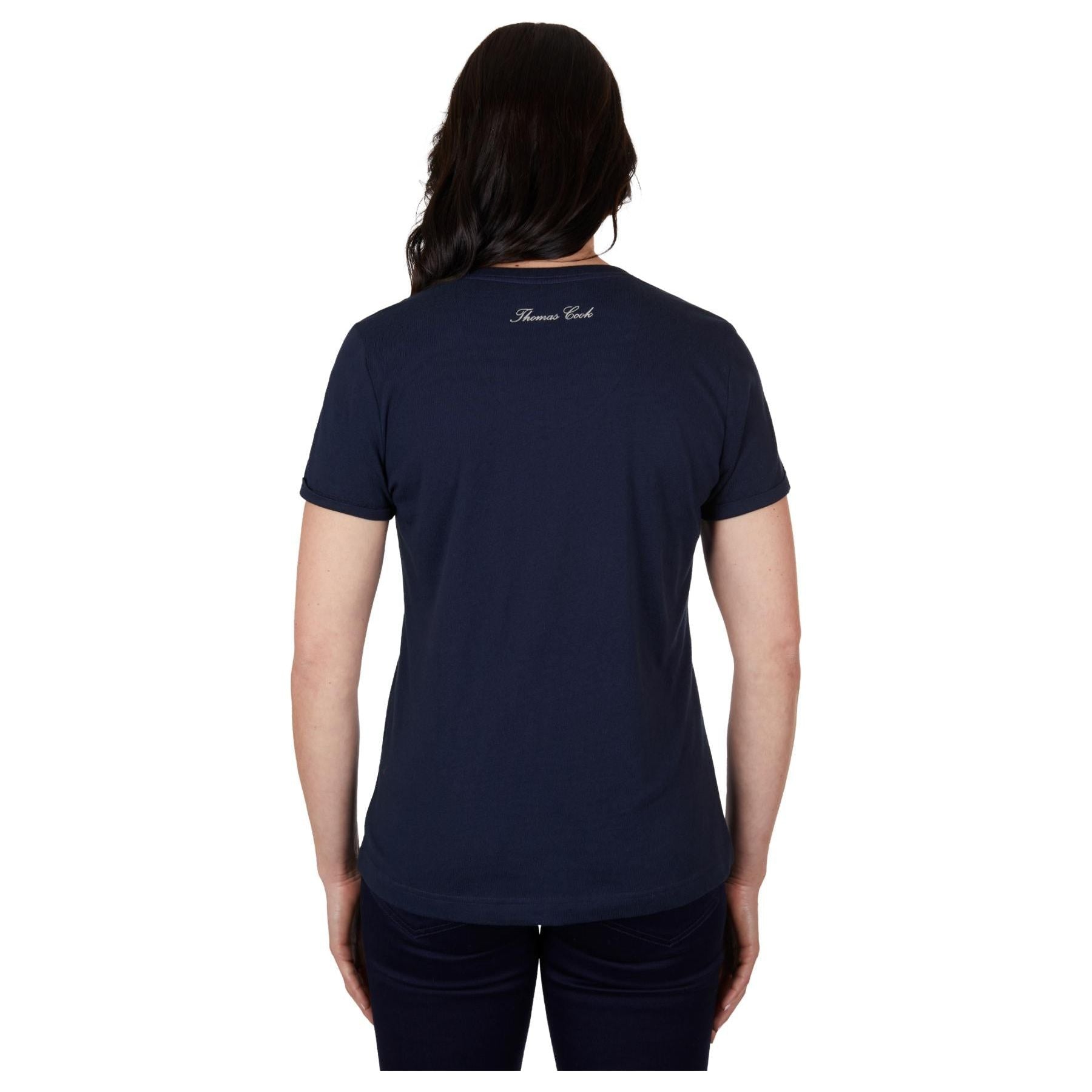 Classic fit tee, large front feature foil print, Thomas Cook logo internal bind, contrast floral piping on inside neck, V neckline, turn back sleeve cuffs