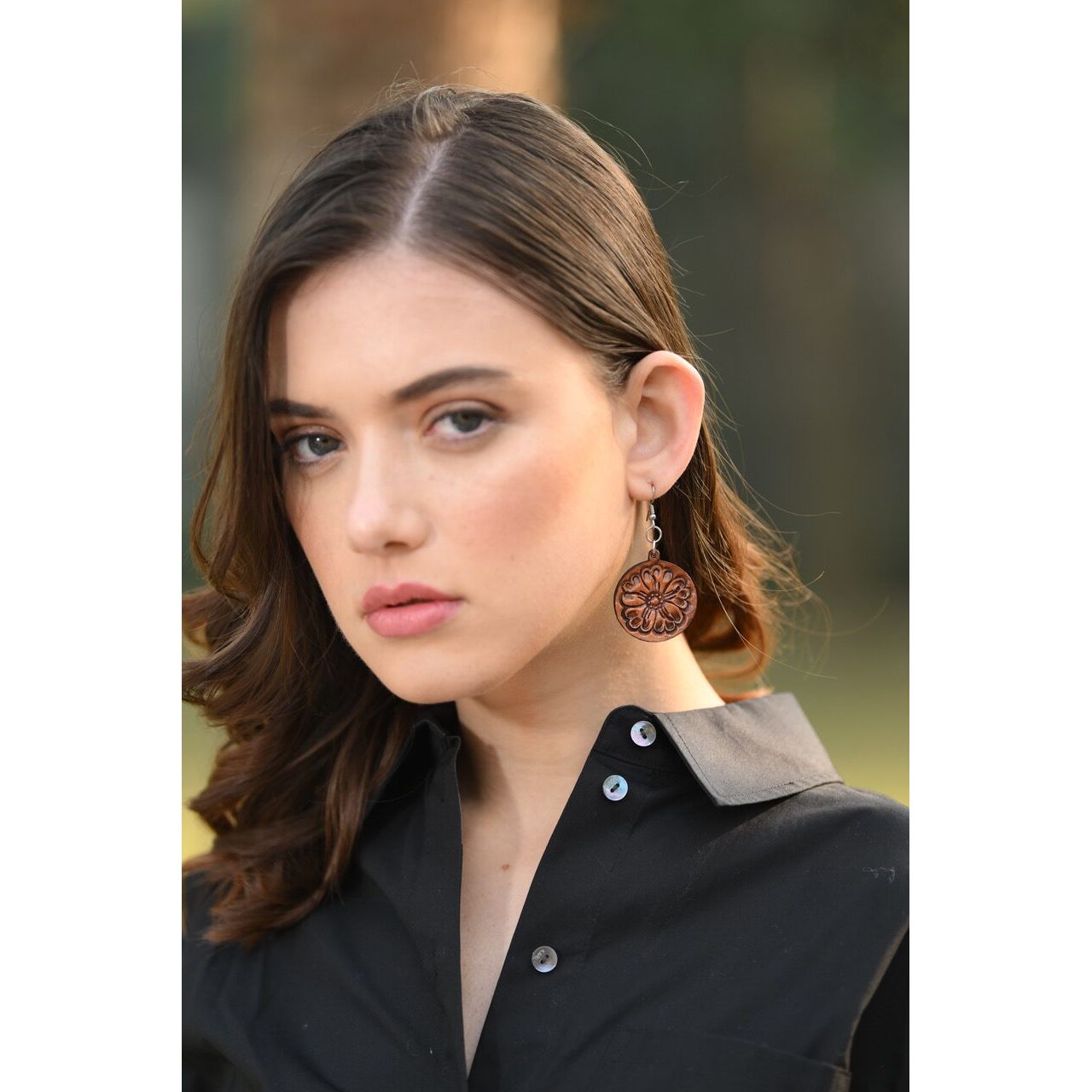 This impressive Tooled Round Shape Surgical Steel earrings are both echt and chic at the same time. With intricate hand tooled details these leather earrings look stunning paired with festival wear, daily denims or even funky evening wear.