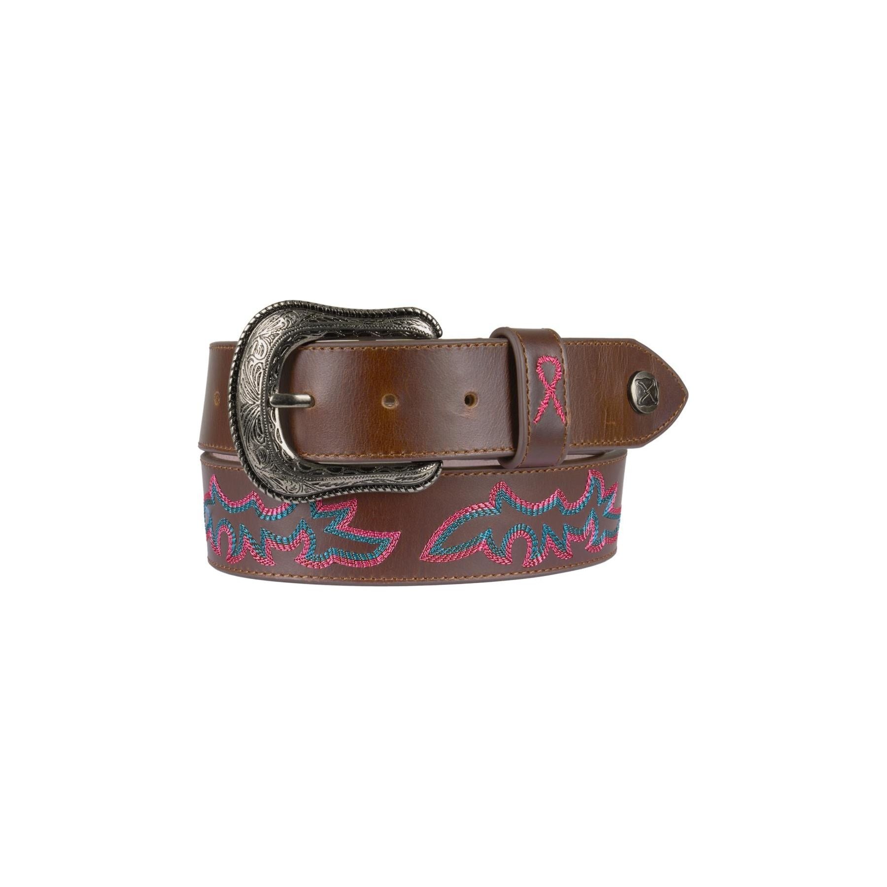 The Pink Ribbon Belt by Twisted X® is a beautifully crafted accessory that combines quality with purpose. Made from full-grain leather, it features embroidered stitch detailing for a refined western look. Finished with the signature Twisted X® metal logo concho and an antique silver buckle, this belt is both durable and stylish.