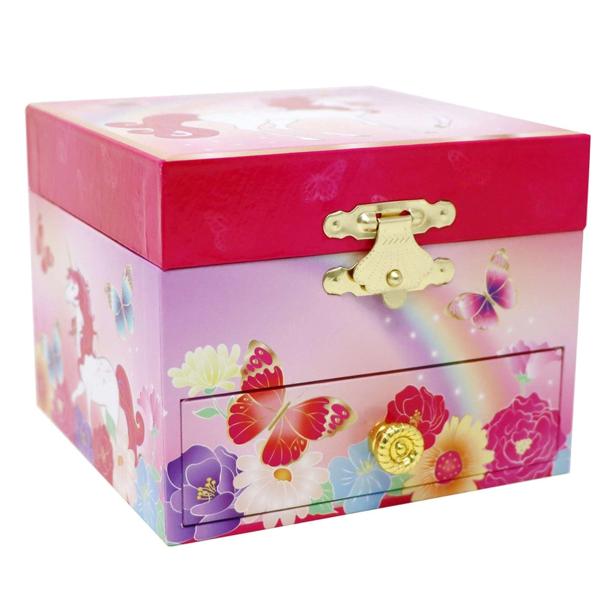 * Size: 10.5W x 8.5H x 10.5D cm * Style: Wind up * Feature 1: Plays the classic tune 'Dance of The Sugar Plum Fairy' * Feature 2: Oval-shaped mirror * Feature 3: Twirling Unicorn figurine * Feature 4: Hot Pink flocked lining * Feature 5: Front drawer for extra storage * Brand: Pink Poppy * Materials: 57% MDF, 23% Metal, 13% Paper, 6% Plastic,1% Others * Care: Wipe clean with a dry cloth * Age: Recommended for ages 3+