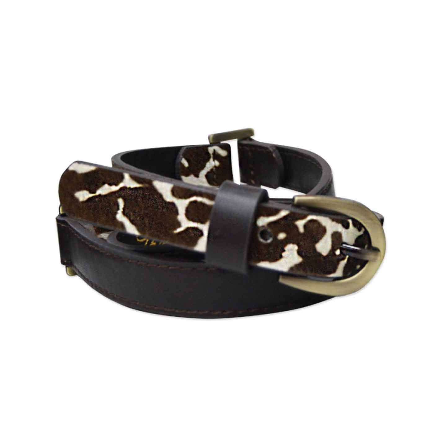 This belt blends authentic leather craftsmanship with a bold two-tone finish, making it stand out as both a practical and fashionable piece. The fur accent on the cow colourway adds texture and uniqueness, while the dark brown balance keeps it versatile.