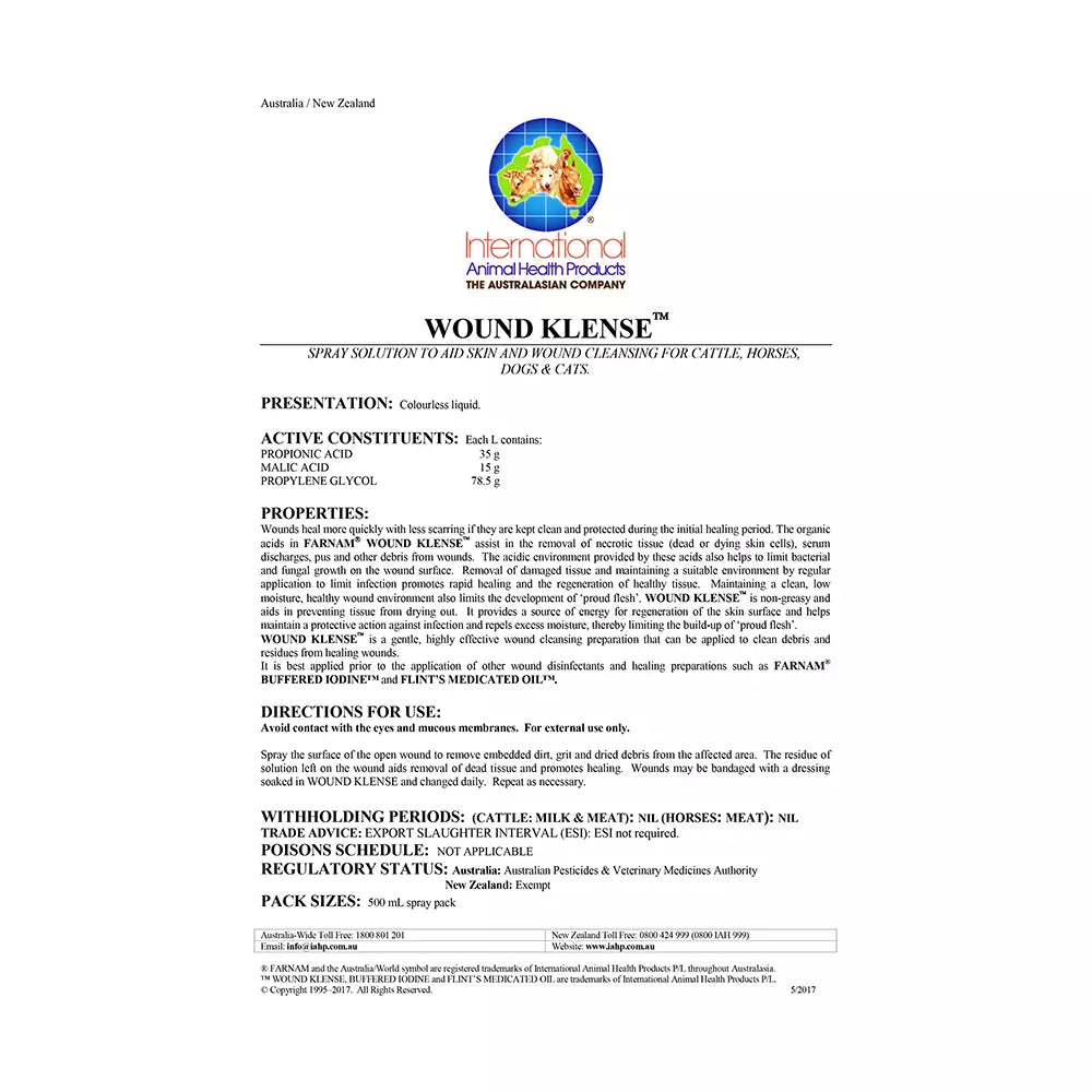 Farnam Wound Klense is a gentle yet highly effective wound cleansing solution designed to remove debris, residues, and necrotic tissue from healing wounds. Formulated with organic acids and propylene glycol, it creates an ideal healing environment while helping to prevent infection, proud flesh, and tissue dryness.