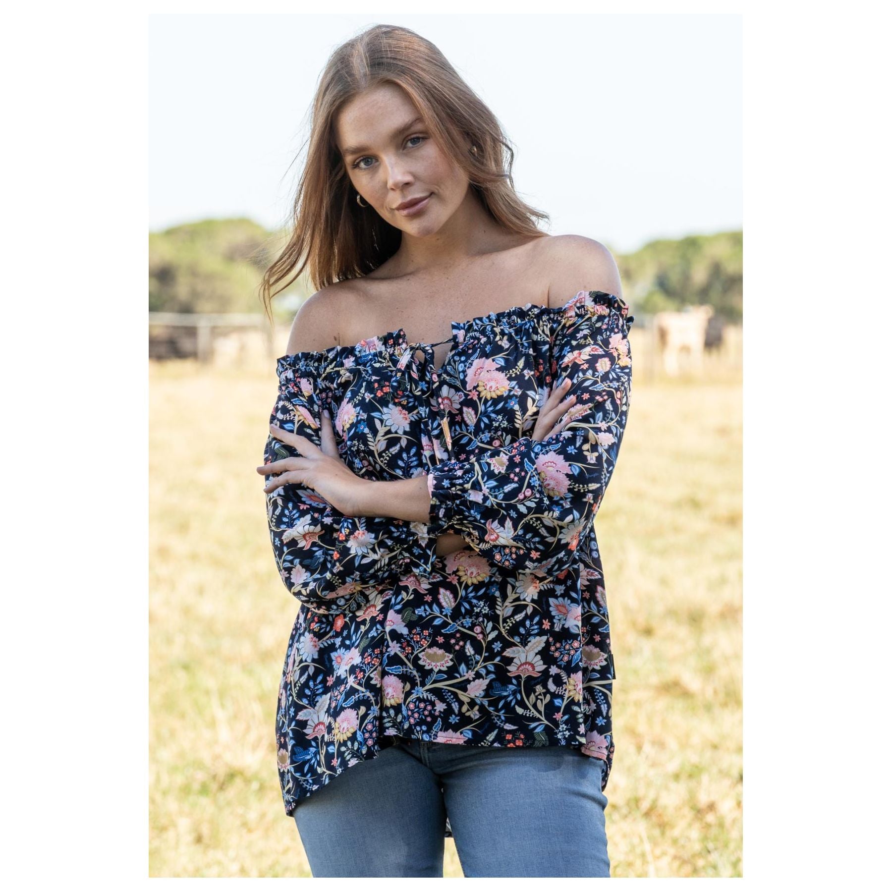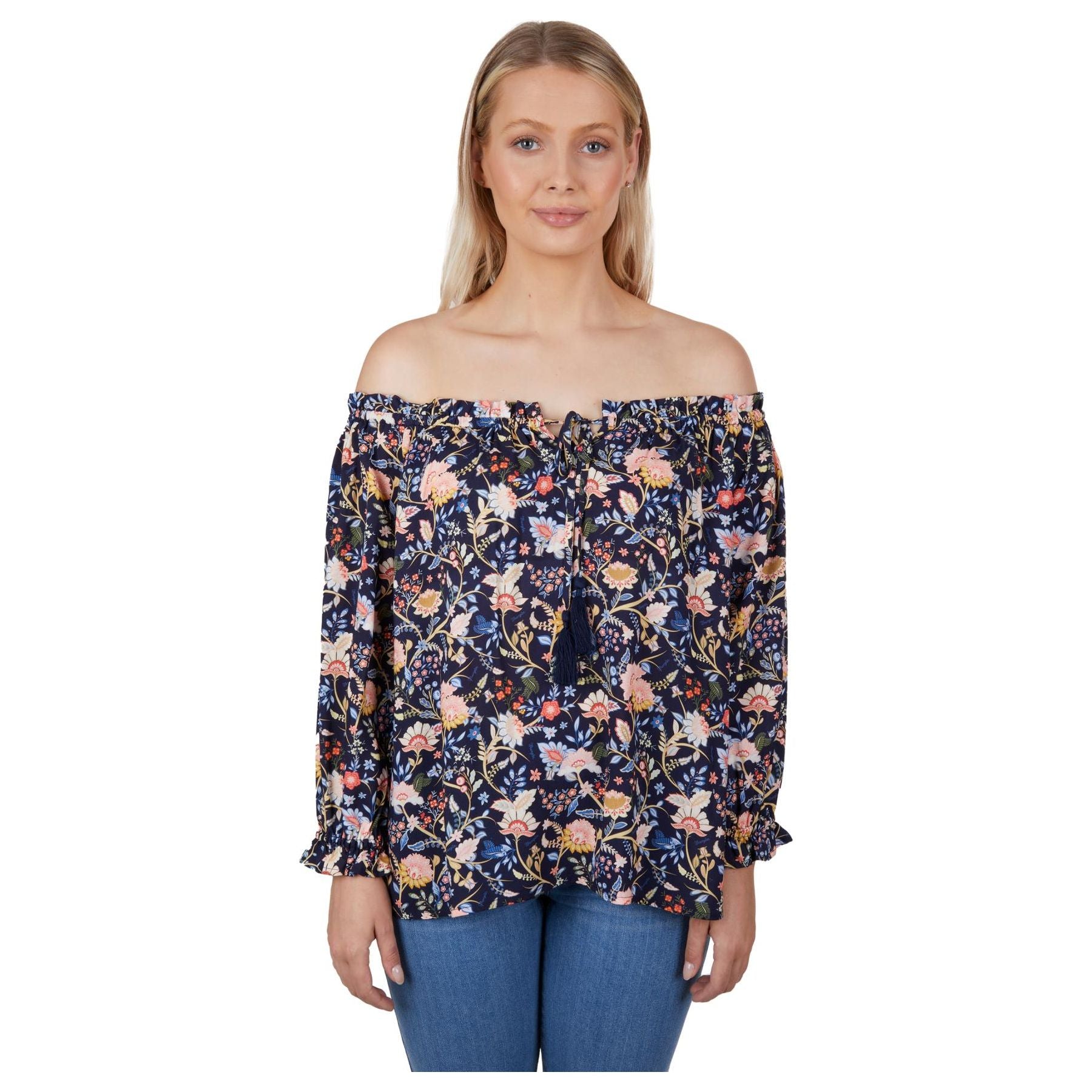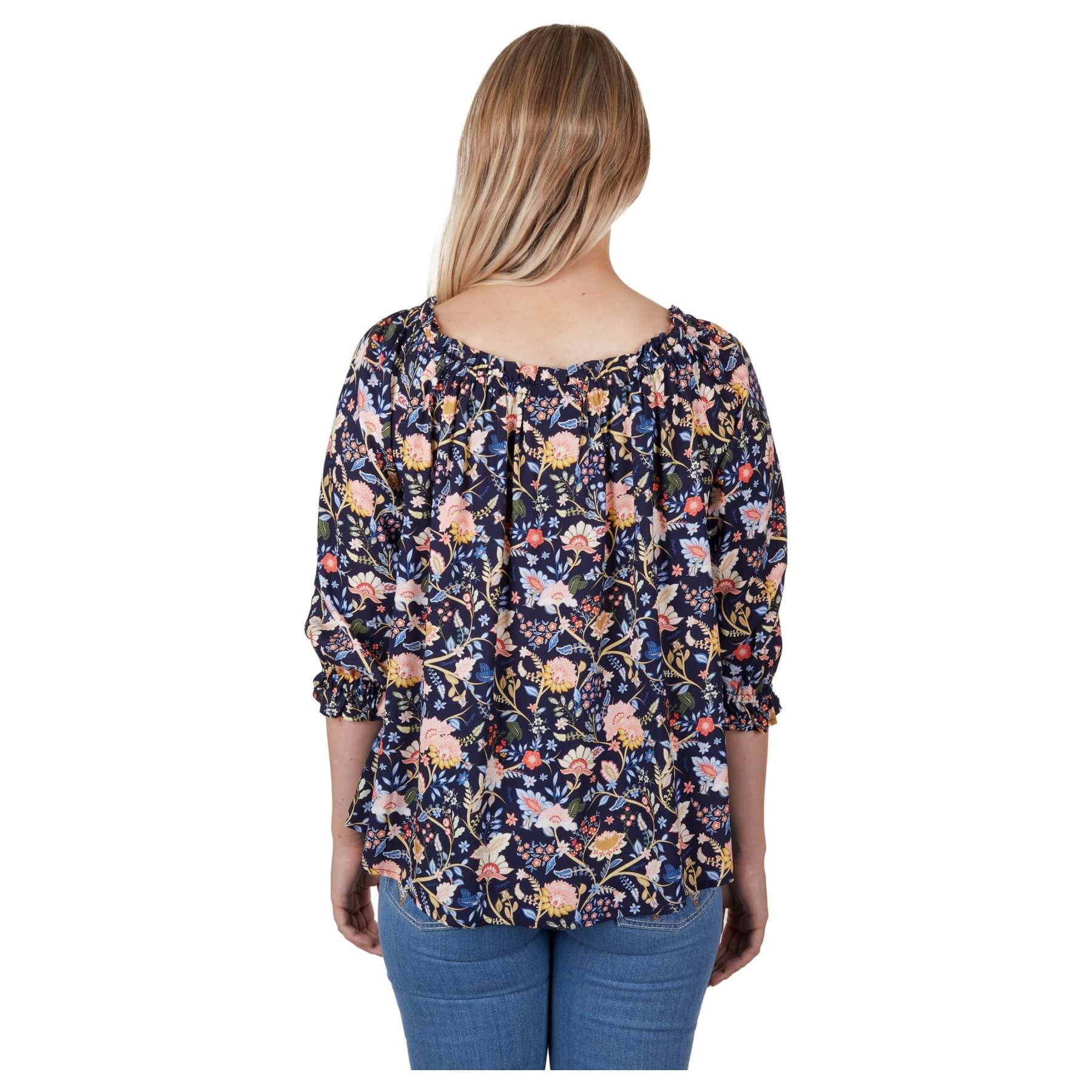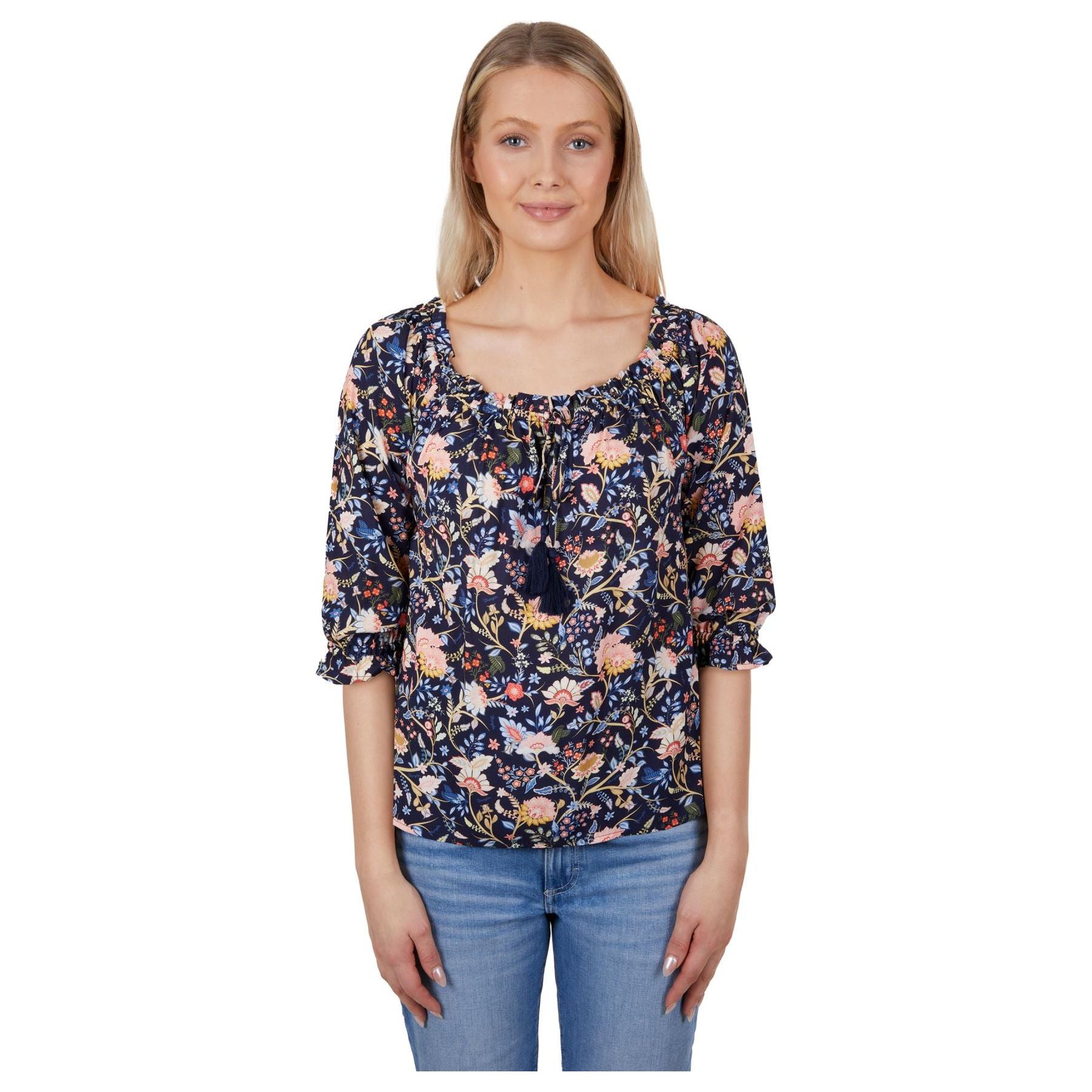3/4 sleeve blouse, v-neckline and tassel detail, Wrangler® logo pip on side seam, soft hand feel and drape