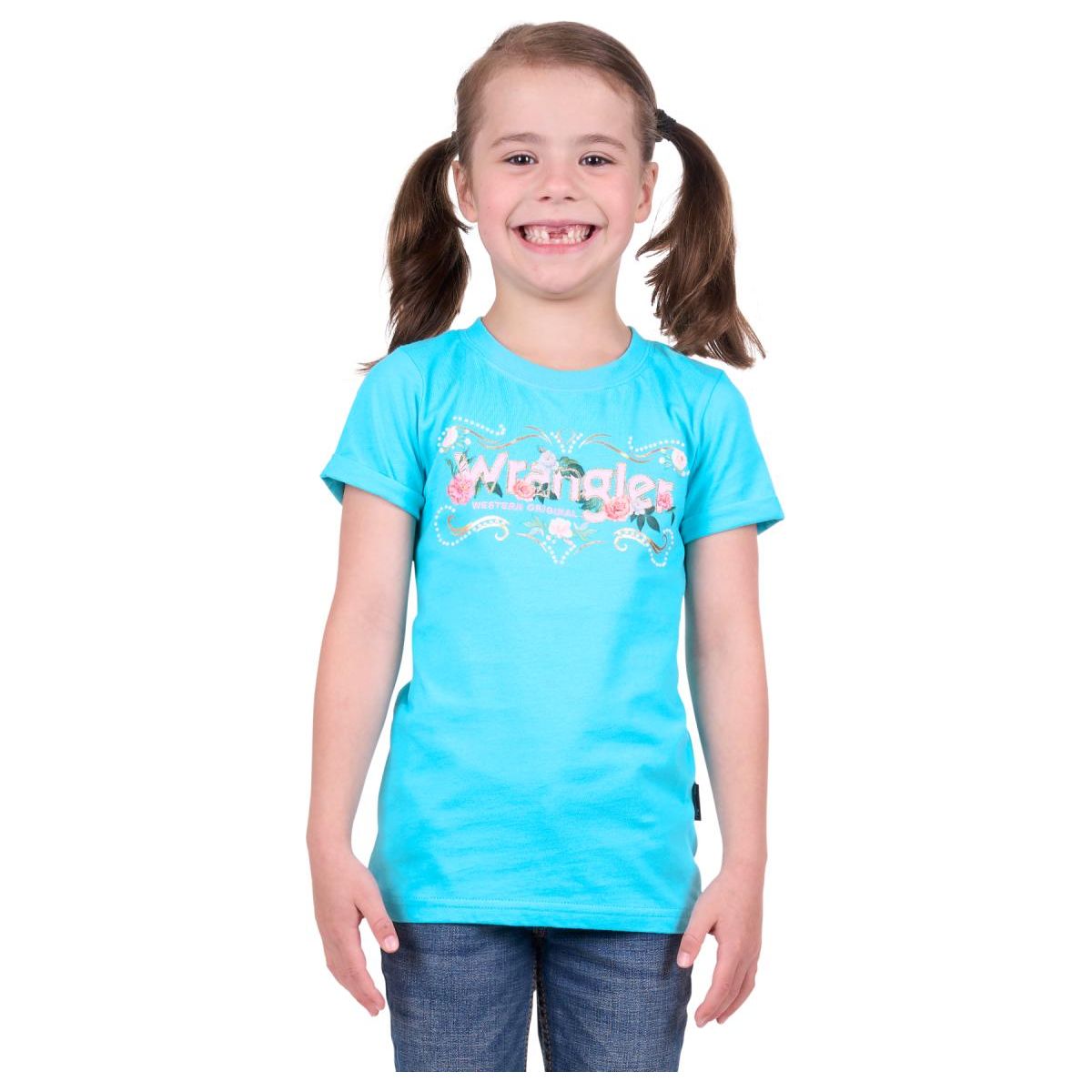 Classic tee shape with rolled sleeve hem detail, rib neck band, Wrangler® logo pip on side seam, original hand drawn Wrangler® iconic logo printed design with embroidery, metallic detail and pearl nail heads (nail head detail for sizes 4-14 only)