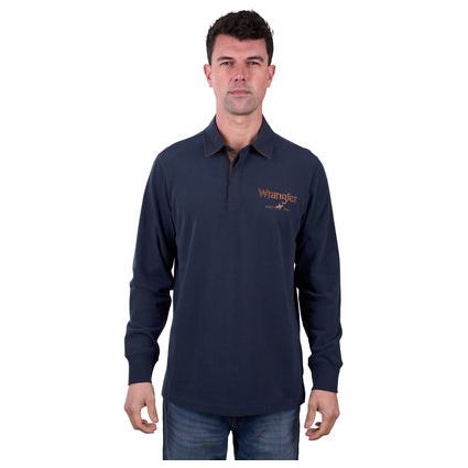Heavyweight jersey knit rugby, concealed buttons on centre front placket, cotton drill collar with contrast underside, contrast herringbone tape trims on inside side seam splits, rib trim cuffs