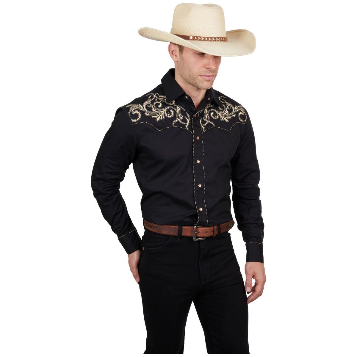 Classic western long sleeve shirt with original hand drawn embroidered front and back yokes, snap closure, piping detail (on front placket, sleeve cuffs and yokes)
