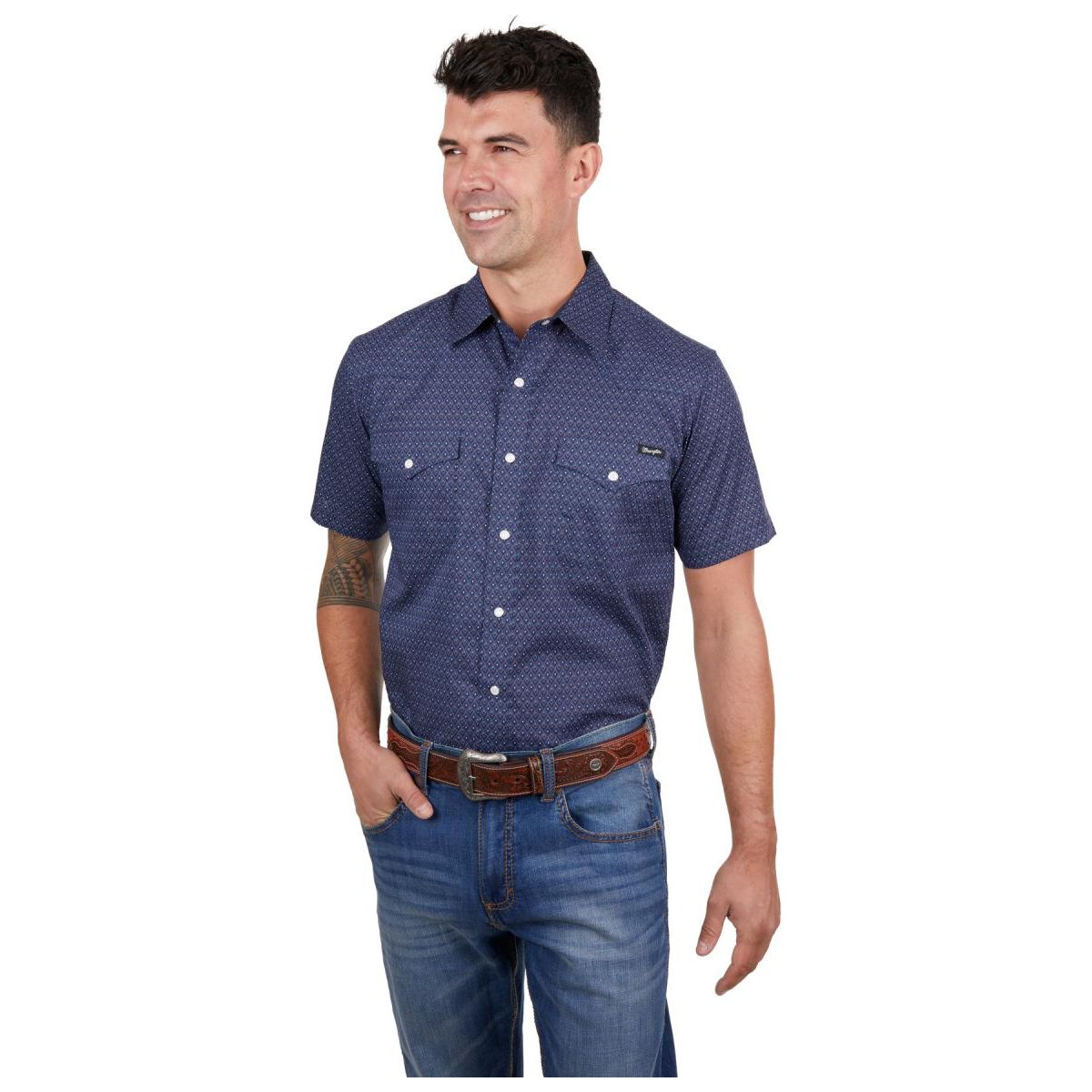 Classic western short sleeve shirt, snap closure, western chest pockets (one with pen holder), western front and back yokes, contrast trim on inside collar stand