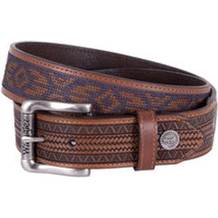 A statement Western belt blending classic tooled leather with striking Aztec embroidery, perfect for both casual and dress occasions.