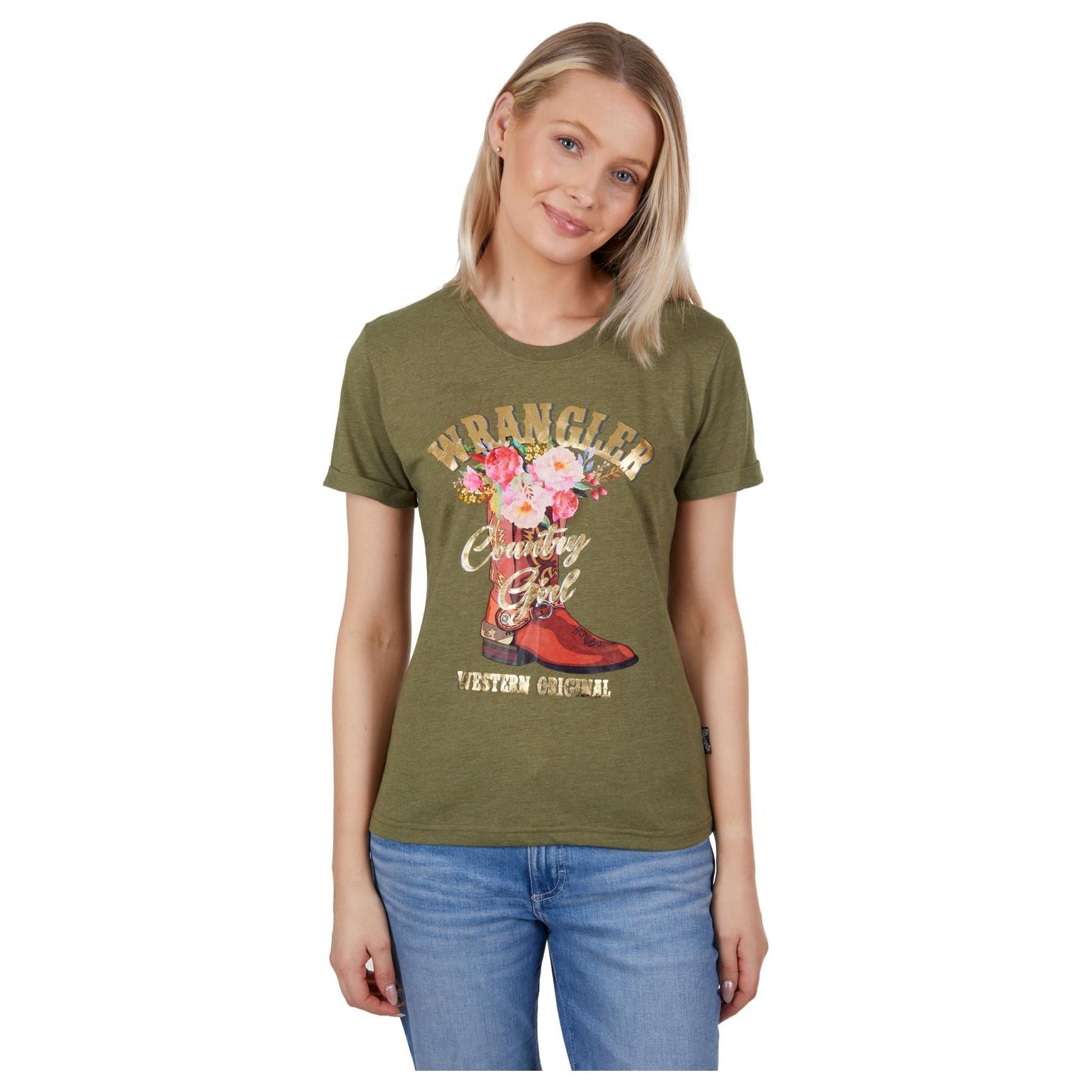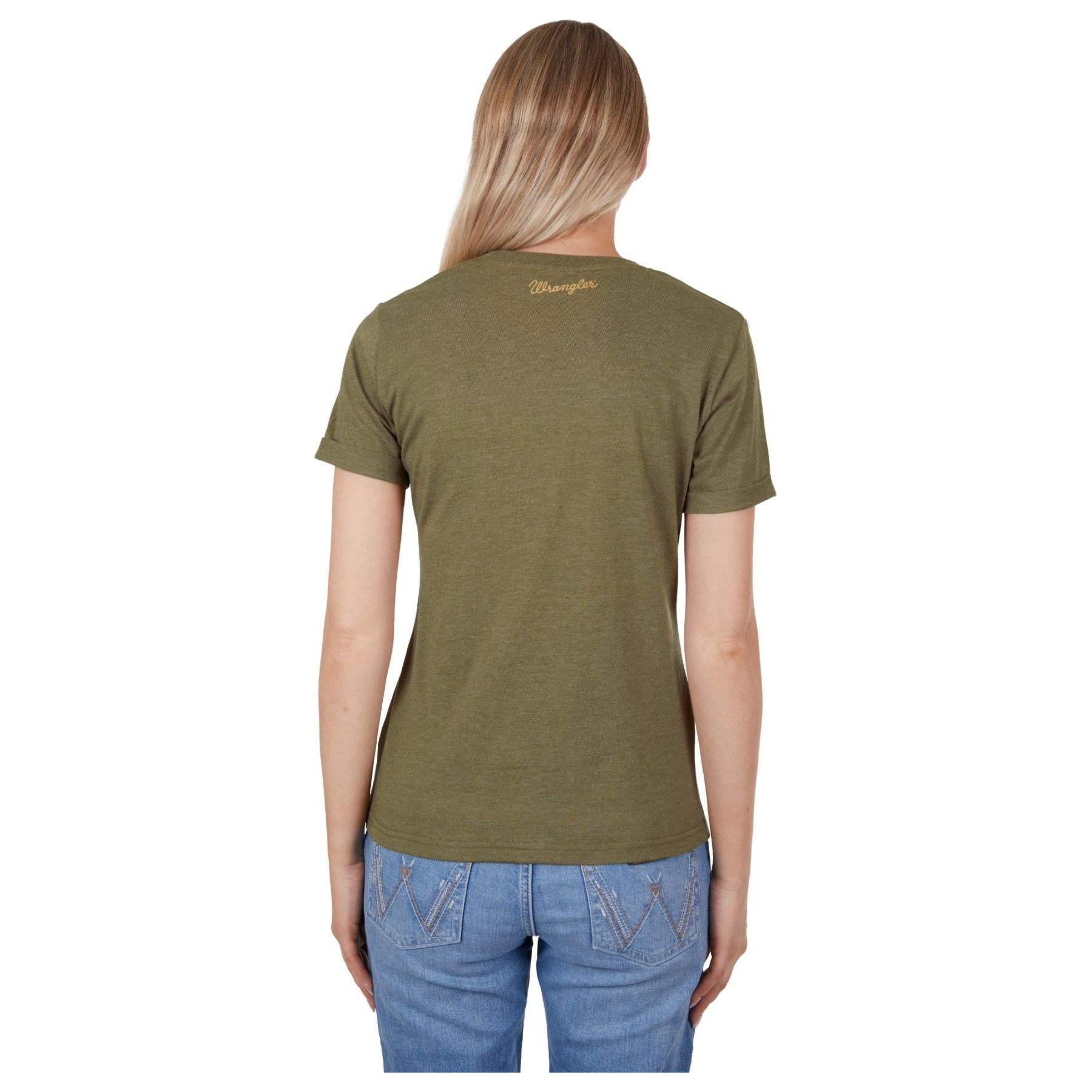 Classic tee shape with rolled sleeve hem detail, rib neck band, Wrangler® logo pip on side seam